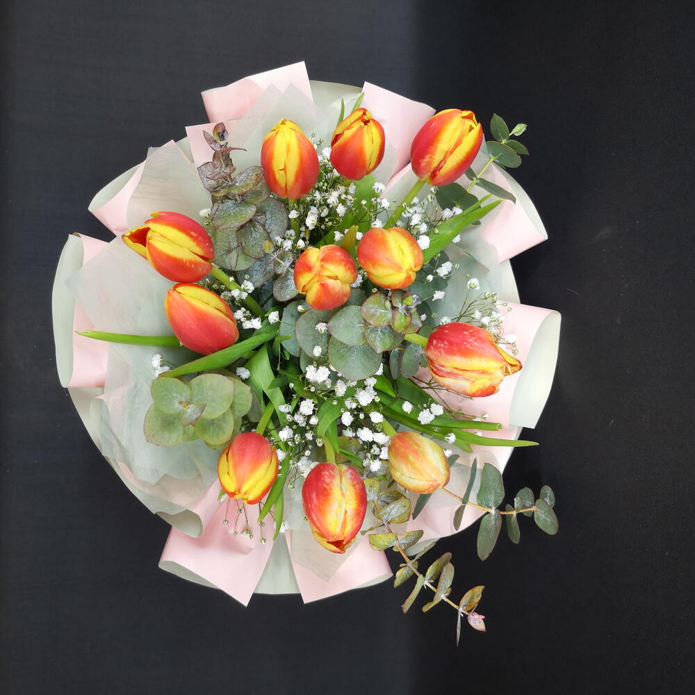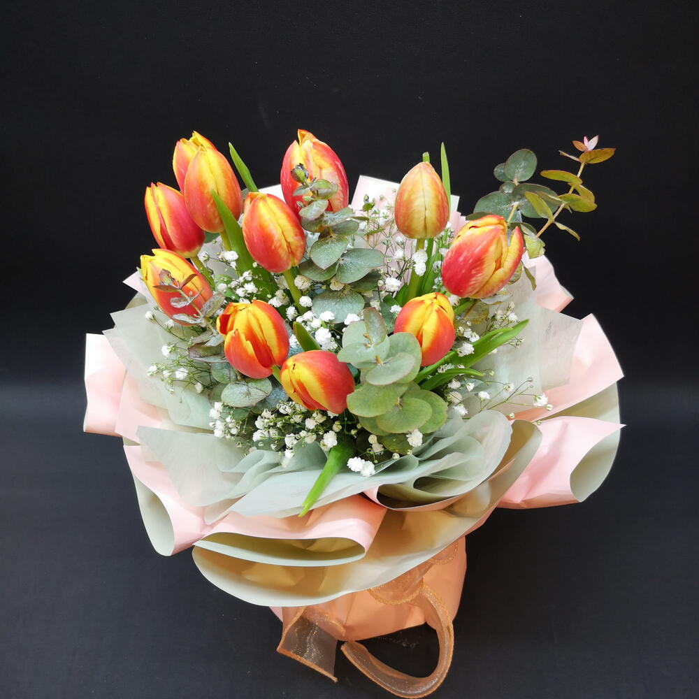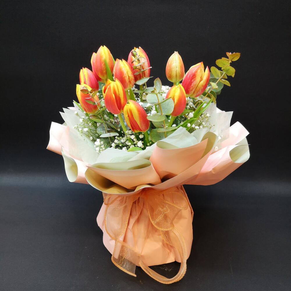 paniculata - 1 pcs eucaliptu - 8 pcs papeles - 3 pcs pie con agual - 1 pcs tulipanes rananjo - 10 pcs