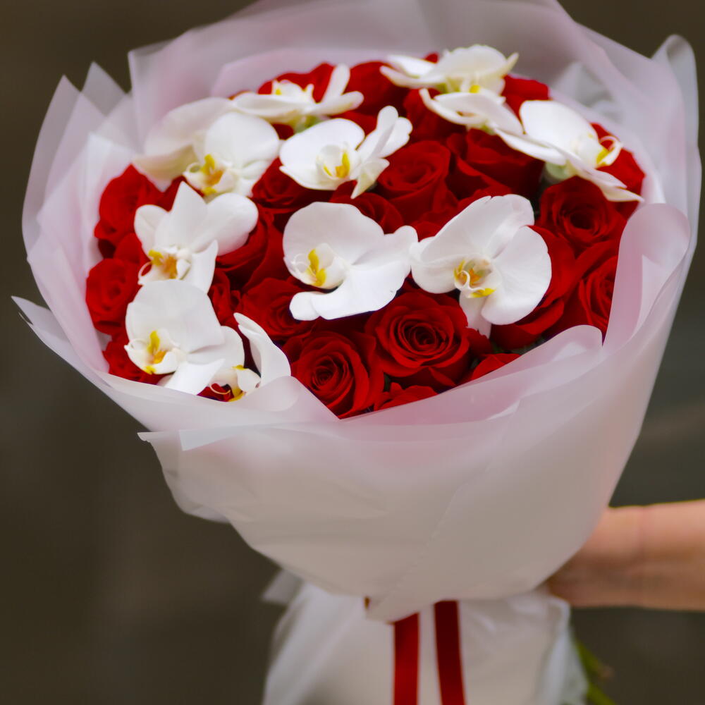 Elegant and classy bouquet of red roses and white orchid. Elegant and classy bouquet of red roses and white orchid. Elegant and classy bouquet of red roses and white orchid.