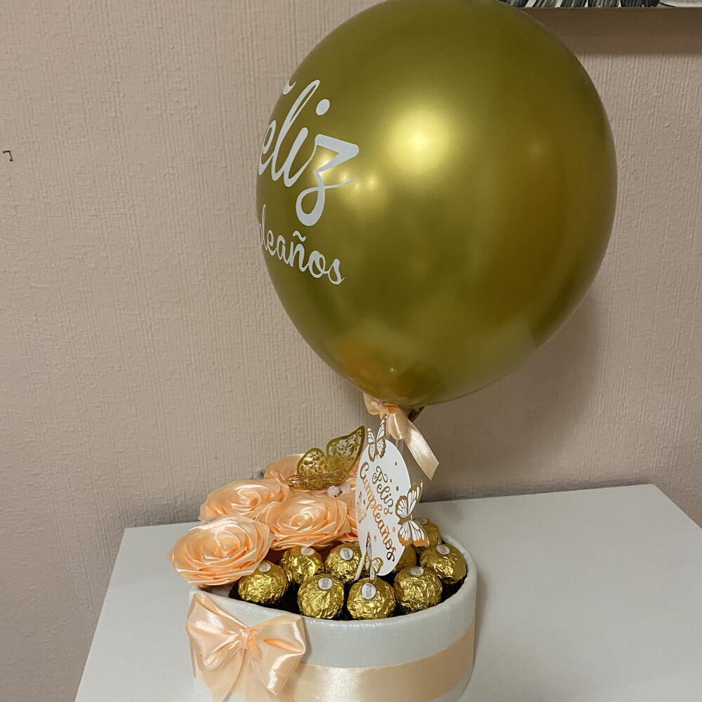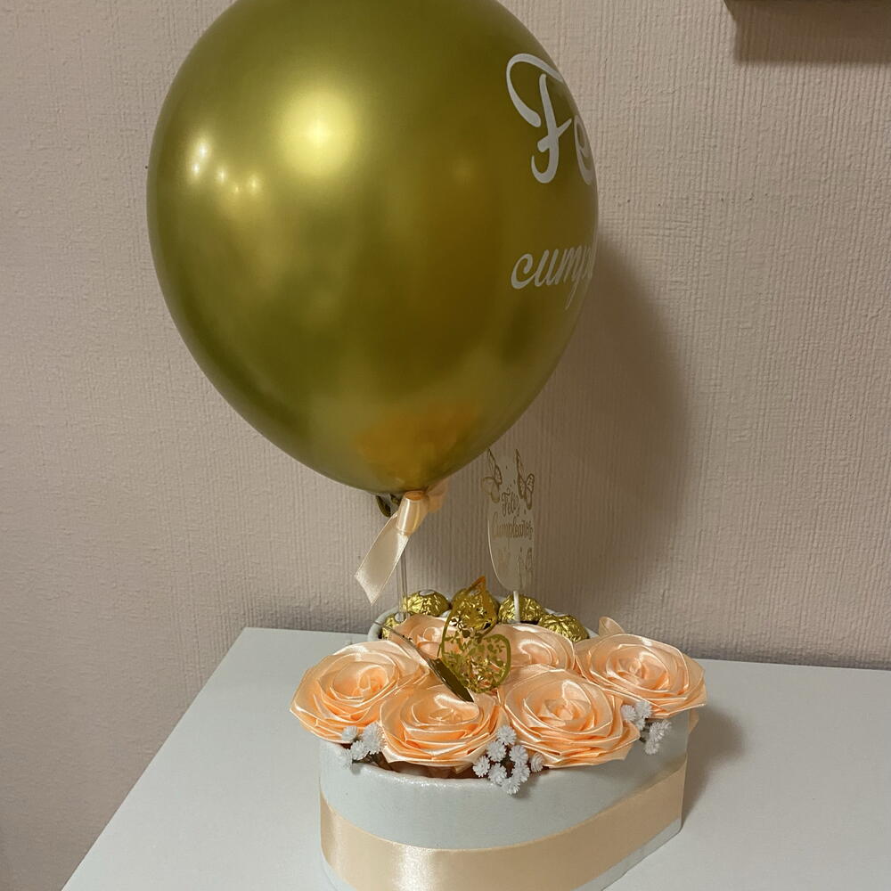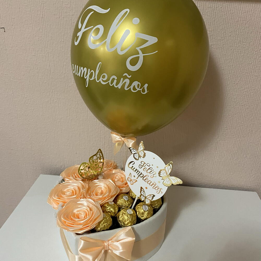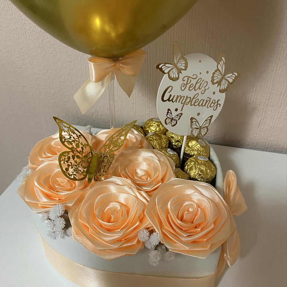 A perfect birthday gift; you don't need to buy anything else. It contains everything necessary to make someone special happy. Unique, completely handmade. 6 handmade eternal roses in a peach satin tone with 9 Ferrero Rocher create an elegant and very pleasing-to-the-eye composition. Perfect for: - a friend - a colleague, coworker - mom - or any special person as a sweet, affectionate gesture Includes 9 high-quality Ferrero Rocher chocolates. Ingredients: milk chocolate, hazelnuts, sugar, vegetable oil (palm), wheat flour, dairy derivatives, cocoa powder, soy lecithin, raising agent, salt and flavorings. Allergens: milk, hazelnuts, gluten and soy.
