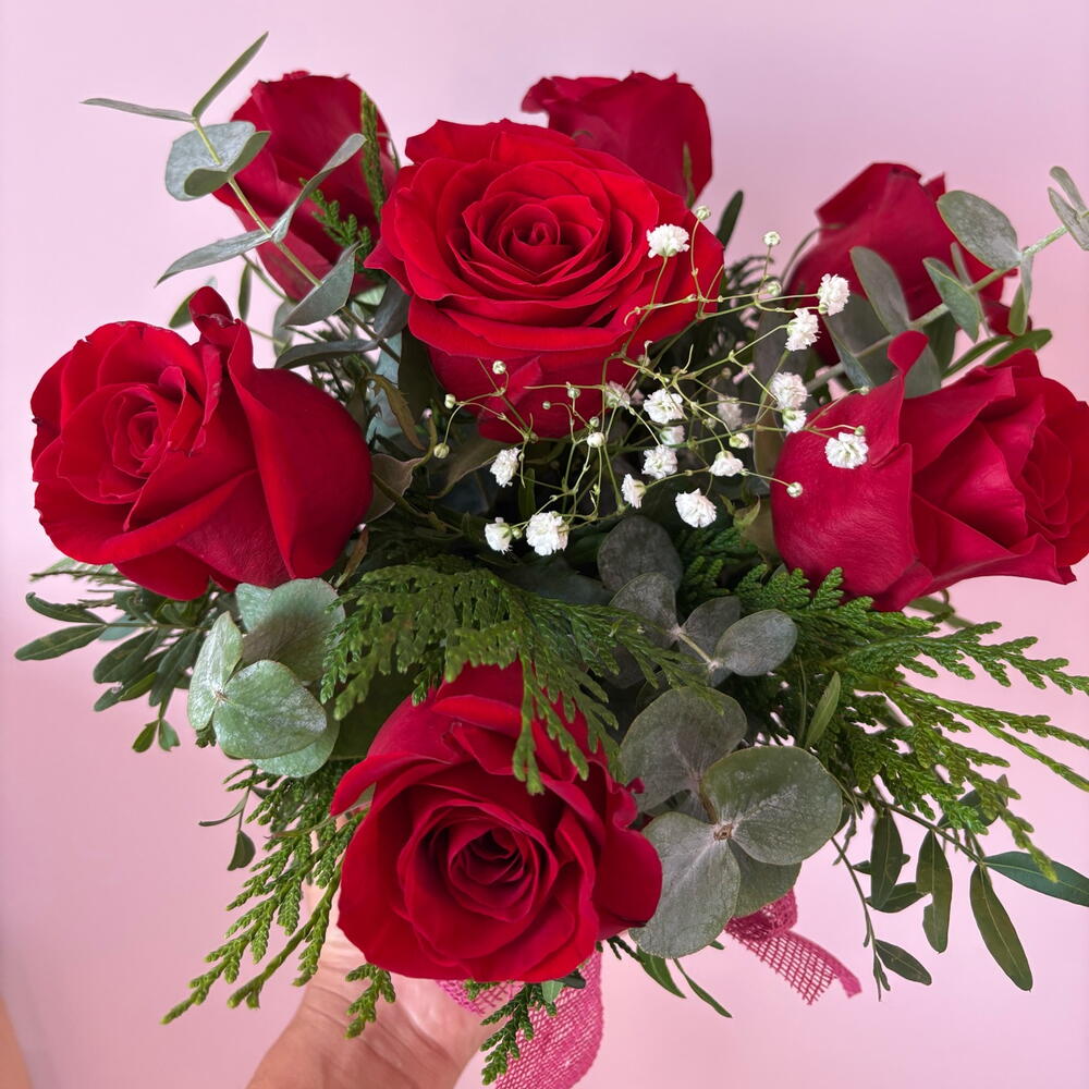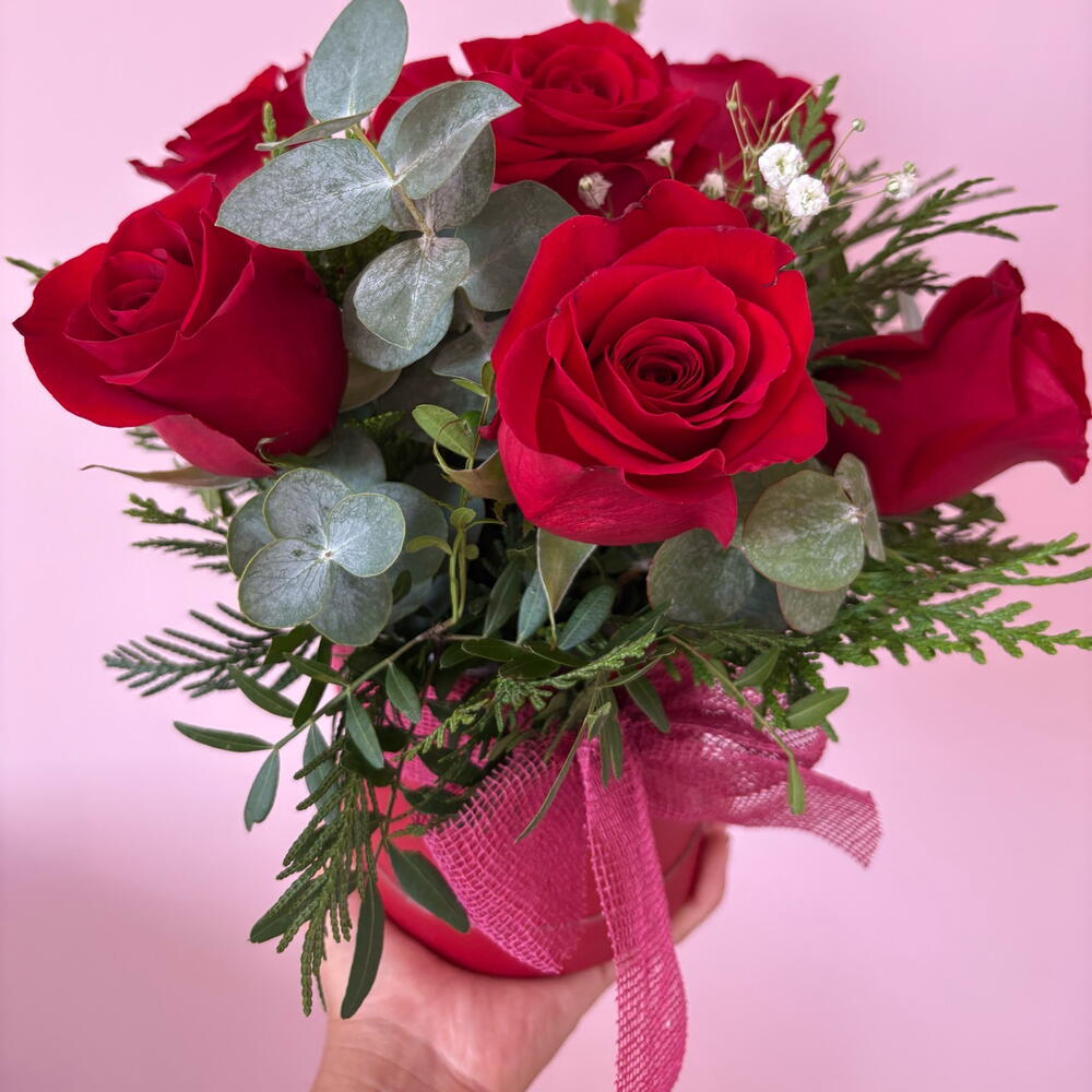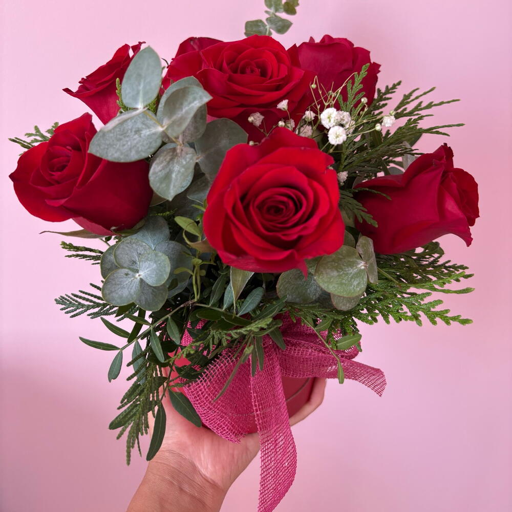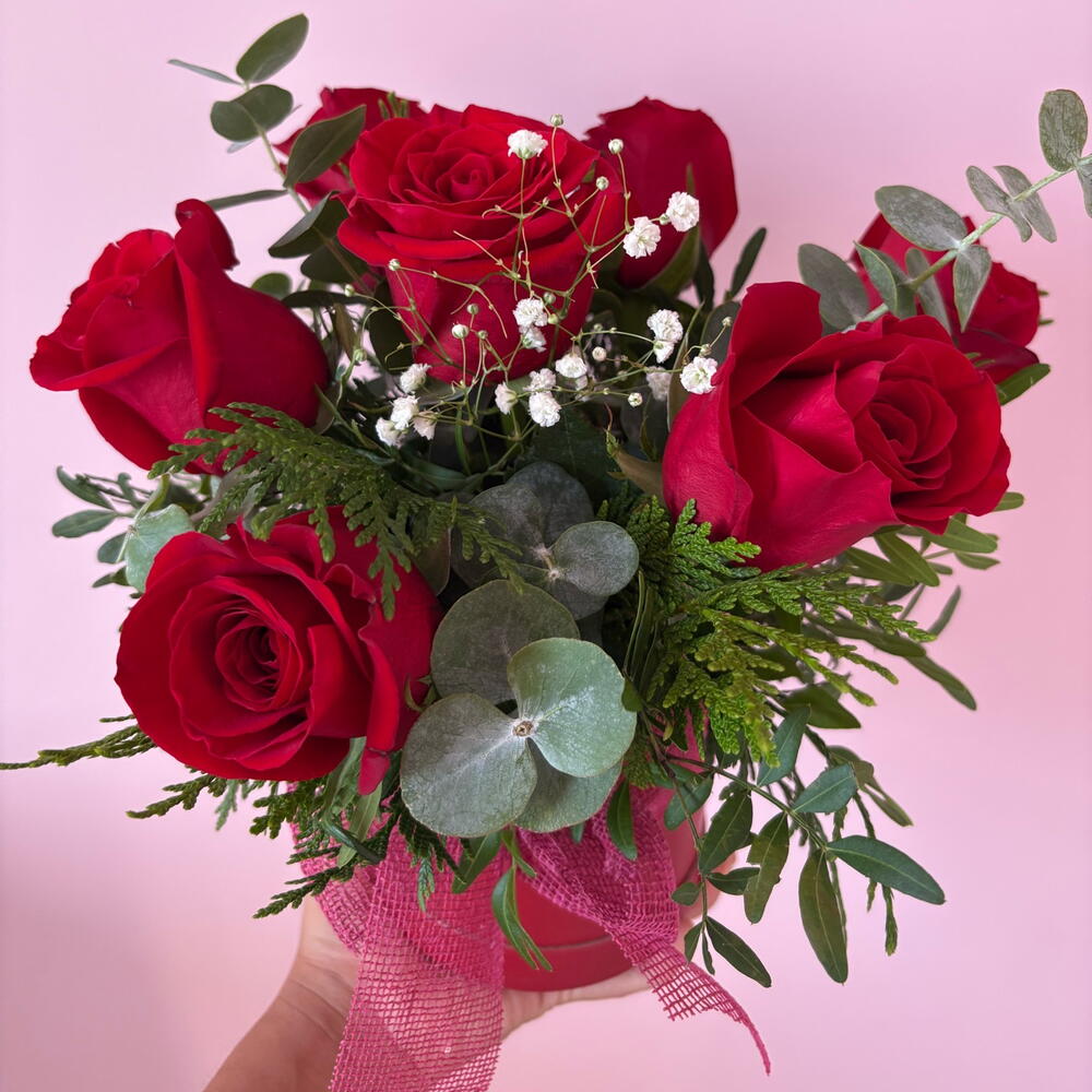 verde decorativo (follaje) - 1 pcs premium red roses - 7 pcs caja sombrerera - 1 pcs