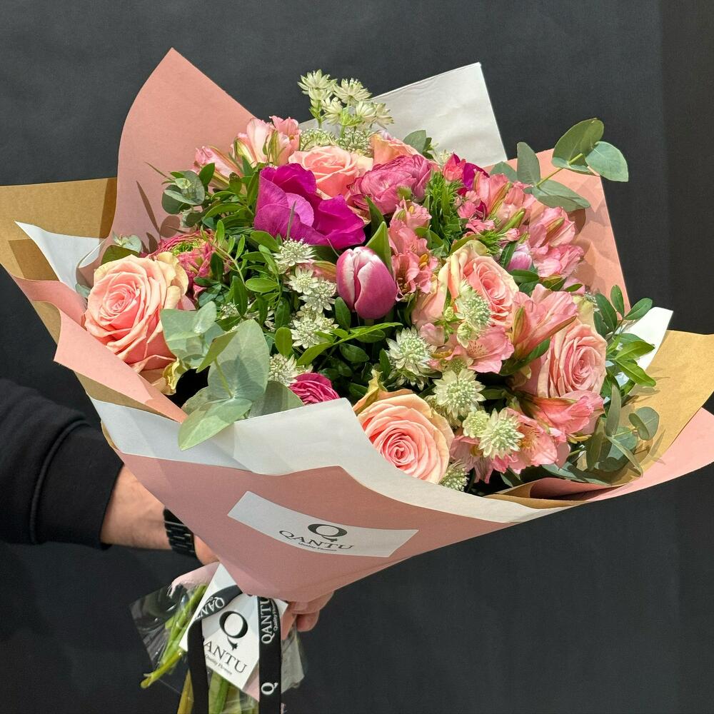 Romance Rosa is a bouquet that celebrates love and tenderness in every detail. With a warm color palette, this arrangement combines the elegance of roses with the freshness of alstroemerias and tulips, creating a harmonious, delicate ensemble. The touch of green foliage and complementary flowers add a sophisticated, natural air, perfect for expressing deep, sincere feelings.
