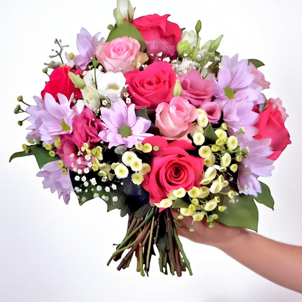 rosas rosadas - 3 pcs verdes variados - 1 pcs margaritas blancas - 3 pcs claveles rosados - 5 pcs pink alstroemeria - 6 pcs lilium pink tone - 2 pcs