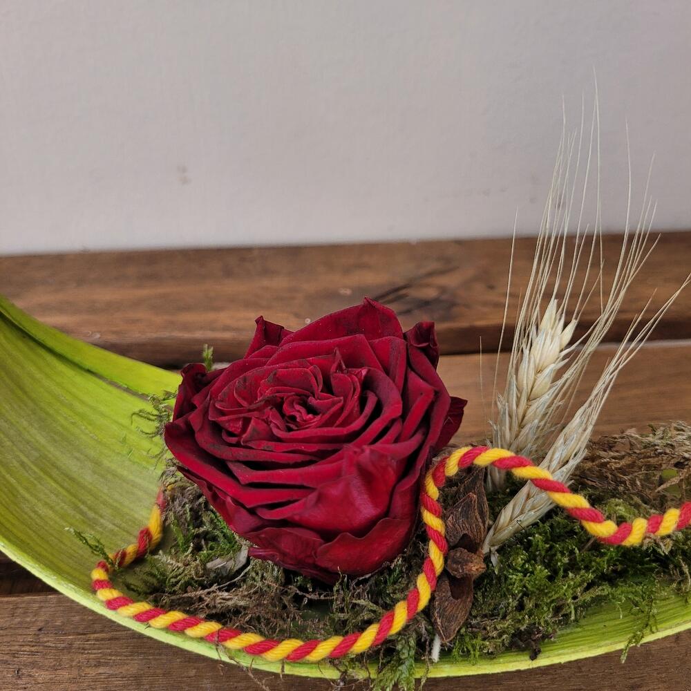 Un detalle original y único que combina la belleza de una rosa roja eterna con elementos naturales como musgo, espigas y una elegante base en forma de hoja verde que recuerda a una barca flotando. Decorado con un lazo típico de Sant Jordi, este diseño minimalista es perfecto para expresar amor y admiración de una manera especial. Ideal para regalar en el Día de Sant Jordi o para decorar con un toque de naturaleza y sofisticación. ¡Un gesto lleno de simbolismo y estilo! Diseño de rosa eterna un regalo que perdura en el tiempo, ideal para regalar ,y sobretodo en Sant Jordi no lo olvidara
