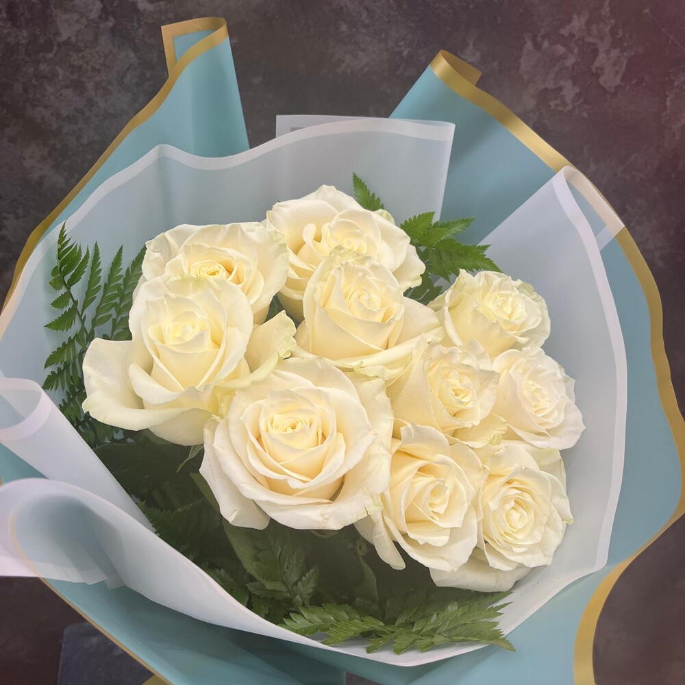 10 white roses and 4 fern leaves and special wrapping