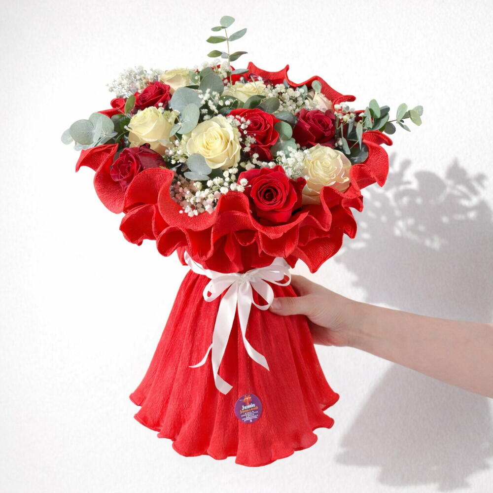 This classic bouquet is a perfect combination of 6 red roses and 6 white roses, accompanied by 15 assorted greens. Any flower lover will adore this bouquet for its delicacy and classic harmony. This is a bouquet that is not only beautiful but also long-lasting and high-quality. It is perfect for any occasion, whether as a gift for a loved one or simply to decorate your home. With these flowers, you'll always have a touch of color and life in any space.