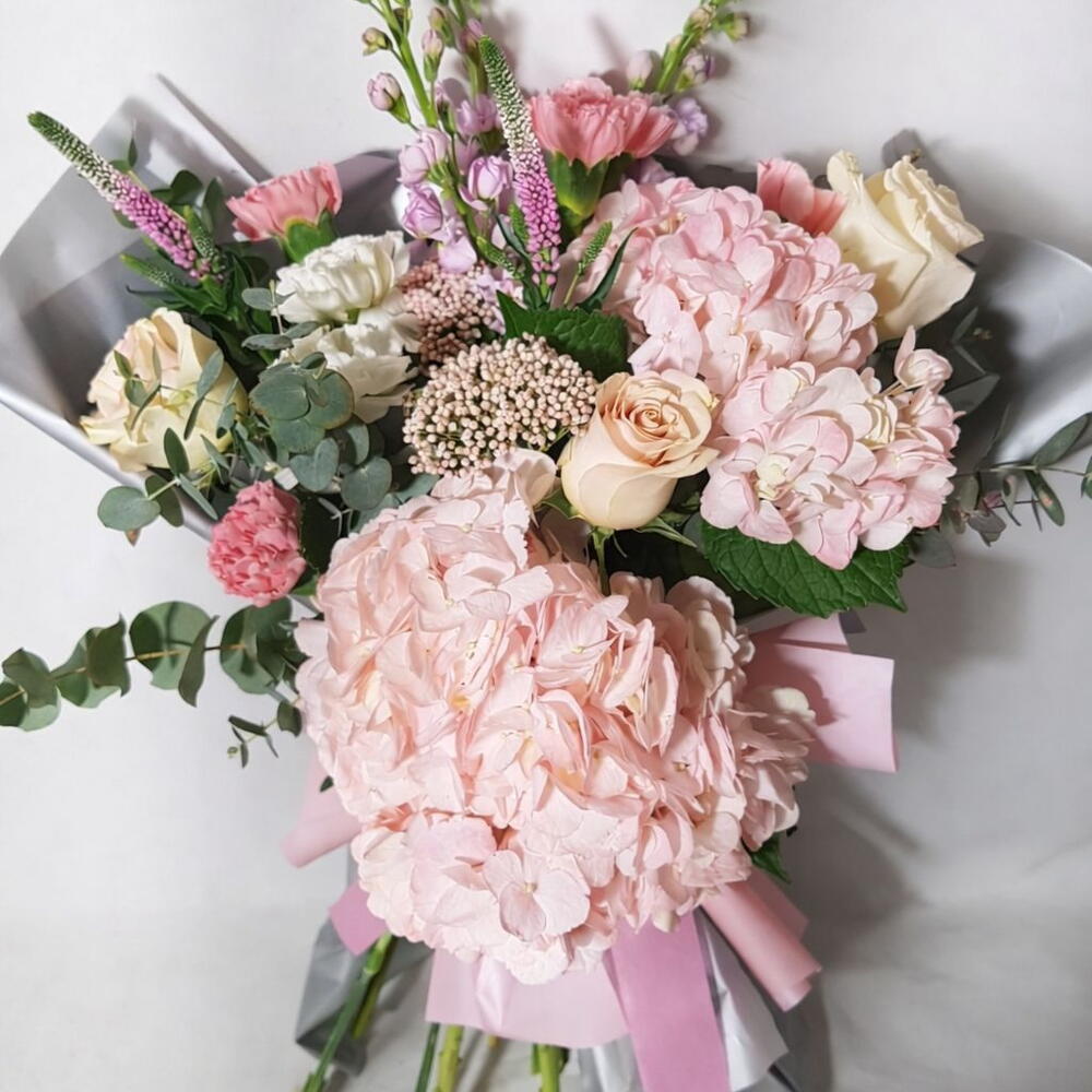 hydrangea - 2 pcs roses - 3 pcs clavel - 7 pcs follaje - 6 pcs verónica - 2 pcs snapdragon - 2 pcs
