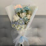 This set includes two exclusive bouquets (one pink and one blue) that stand out for the volume and elegance of their main flowers: • White Roses in "Reflex" Technique: 8 premium white roses, handcrafted petal by petal to achieve full bloom and a majestic look. • Imported Hydrangeas: A fluffy base of pink hydrangea and blue hydrangea that adds body and softness. • Special Touches: * 4 roses dyed in a subtle blue tone. • 3 stems of spray roses (pitiminí roses) in pink for a romantic touch. • Filler and Texture: A cloud of white baby's breath and a selection of carnations in white and pink tones that complete the design. Gala Presentation: • Trendy Wrapping: Pure white Korean paper combined with holographic paper that creates magical flashes with the light. • Ethereal Finish: Each bouquet is crowned with a voluminous white tulle bow and matching satin ribbons. 📐 Ideal for: • Gender Reveal: The perfect photo for the announcement on social media. • Baby Showers: Main table decoration or a gift for the expectant parents. • Newborns: A delicate detail to welcome the baby.