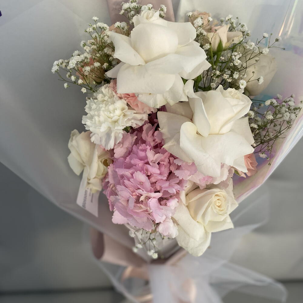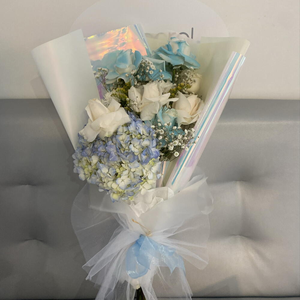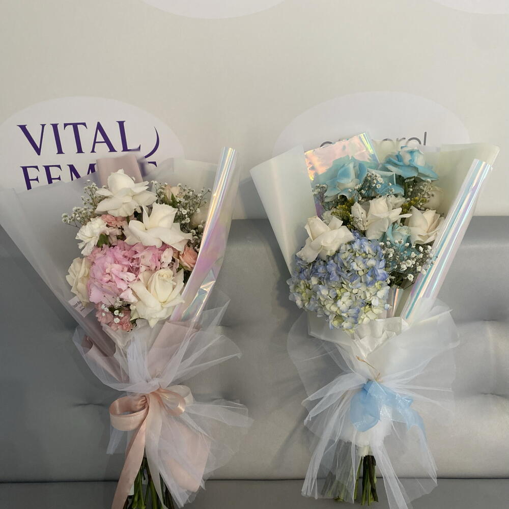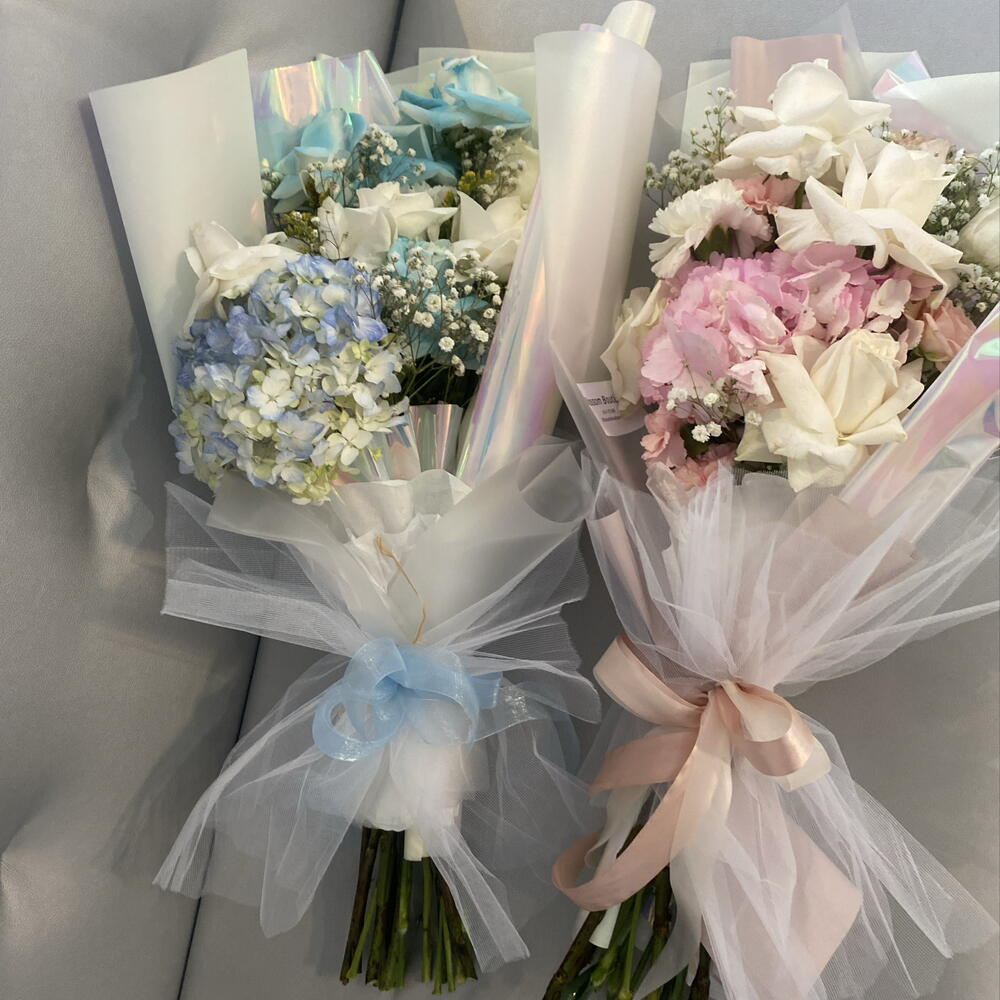 This set includes two exclusive bouquets (one pink and one blue) that stand out for the volume and elegance of their main flowers: • White Roses in "Reflex" Technique: 8 premium white roses, handcrafted petal by petal to achieve full bloom and a majestic look. • Imported Hydrangeas: A fluffy base of pink hydrangea and blue hydrangea that adds body and softness. • Special Touches: * 4 roses dyed in a subtle blue tone. • 3 stems of spray roses (pitiminí roses) in pink for a romantic touch. • Filler and Texture: A cloud of white baby's breath and a selection of carnations in white and pink tones that complete the design. Gala Presentation: • Trendy Wrapping: Pure white Korean paper combined with holographic paper that creates magical flashes with the light. • Ethereal Finish: Each bouquet is crowned with a voluminous white tulle bow and matching satin ribbons. 📐 Ideal for: • Gender Reveal: The perfect photo for the announcement on social media. • Baby Showers: Main table decoration or a gift for the expectant parents. • Newborns: A delicate detail to welcome the baby.