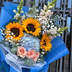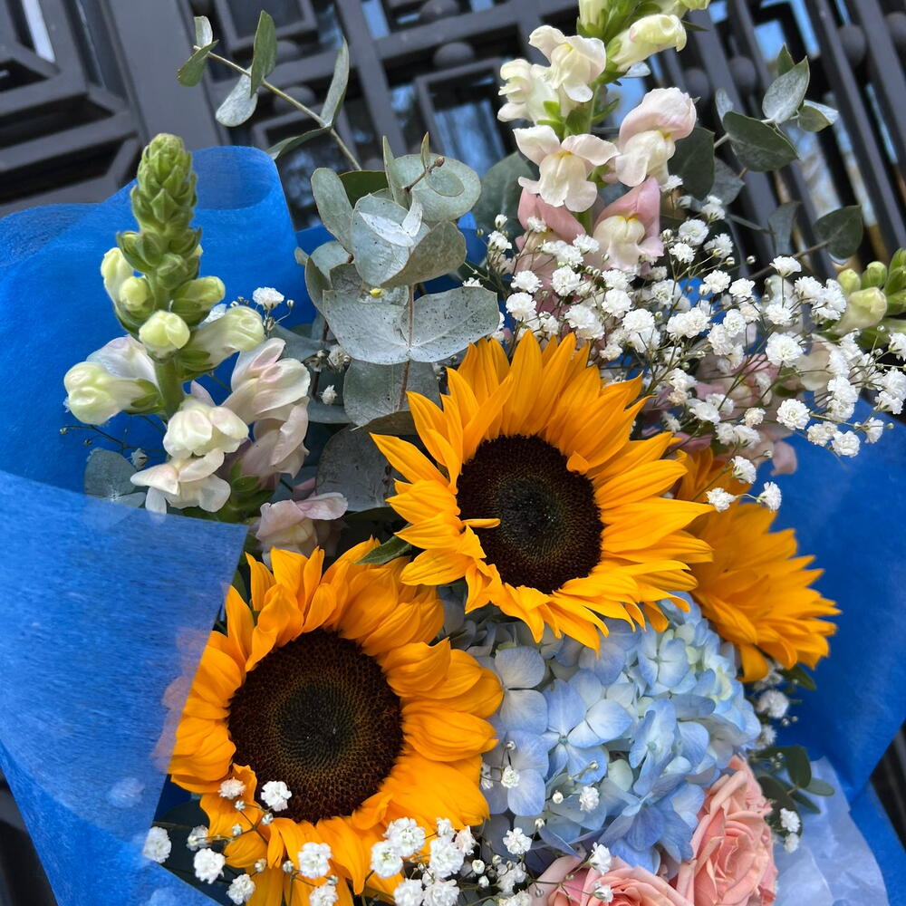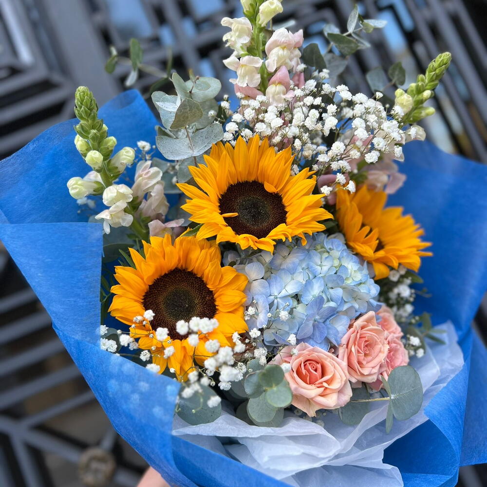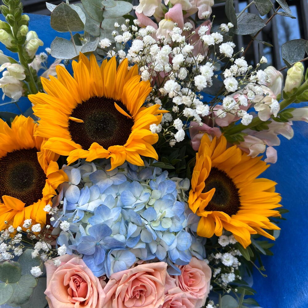 This bouquet is like a little piece of summer: the sunflowers shine like little suns among delicate roses, an ethereal hydrangea and elegant foliage. The harmony of warm and cool tones creates a sense of joy, tenderness and light. A perfect gift to say: “You brighten my day.” 🌻✨