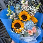 paniculata - 2 pcs eucalipto cinerea - 3 pcs girasoles - 3 pcs pink spray rose - 1 pcs blue hydrangea - 1 pcs antirium - 3 pcs papel decorativo - 3 pcs