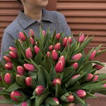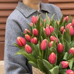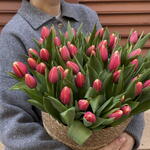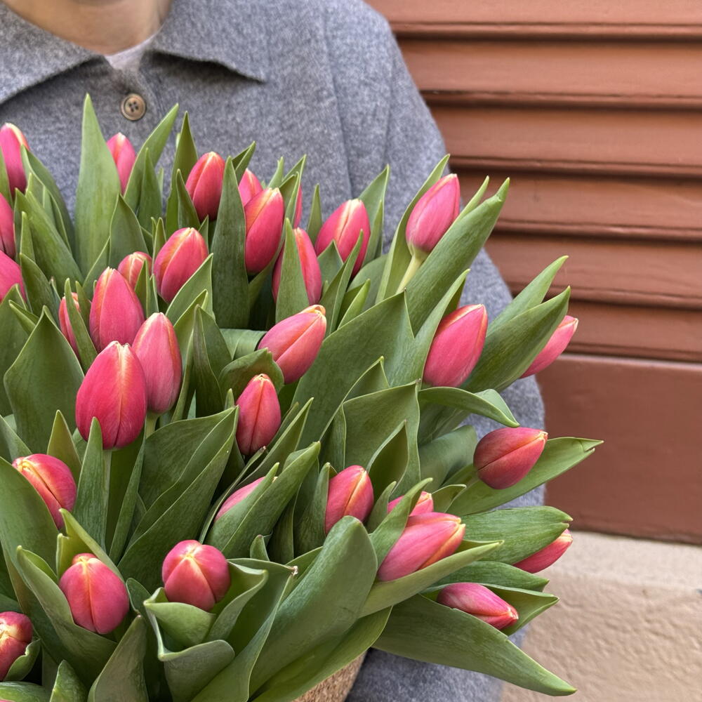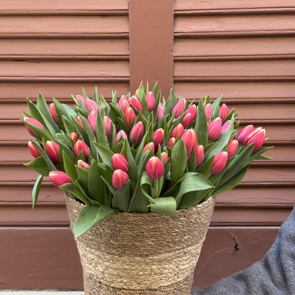 Bouquet of pink tulips in a decorative pot, elegant and fresh. Perfect for adding color and warmth to any space.