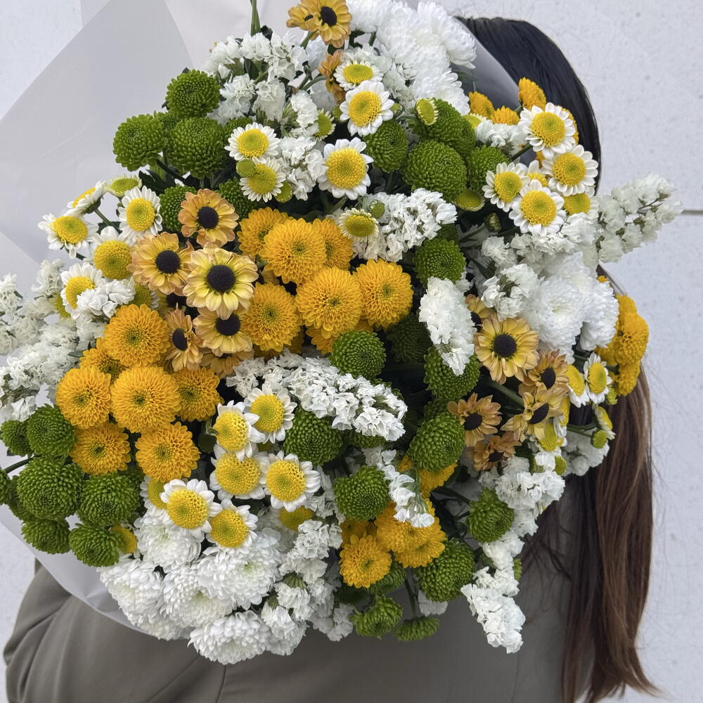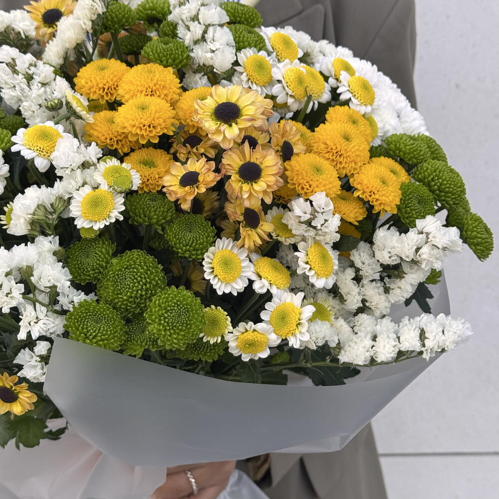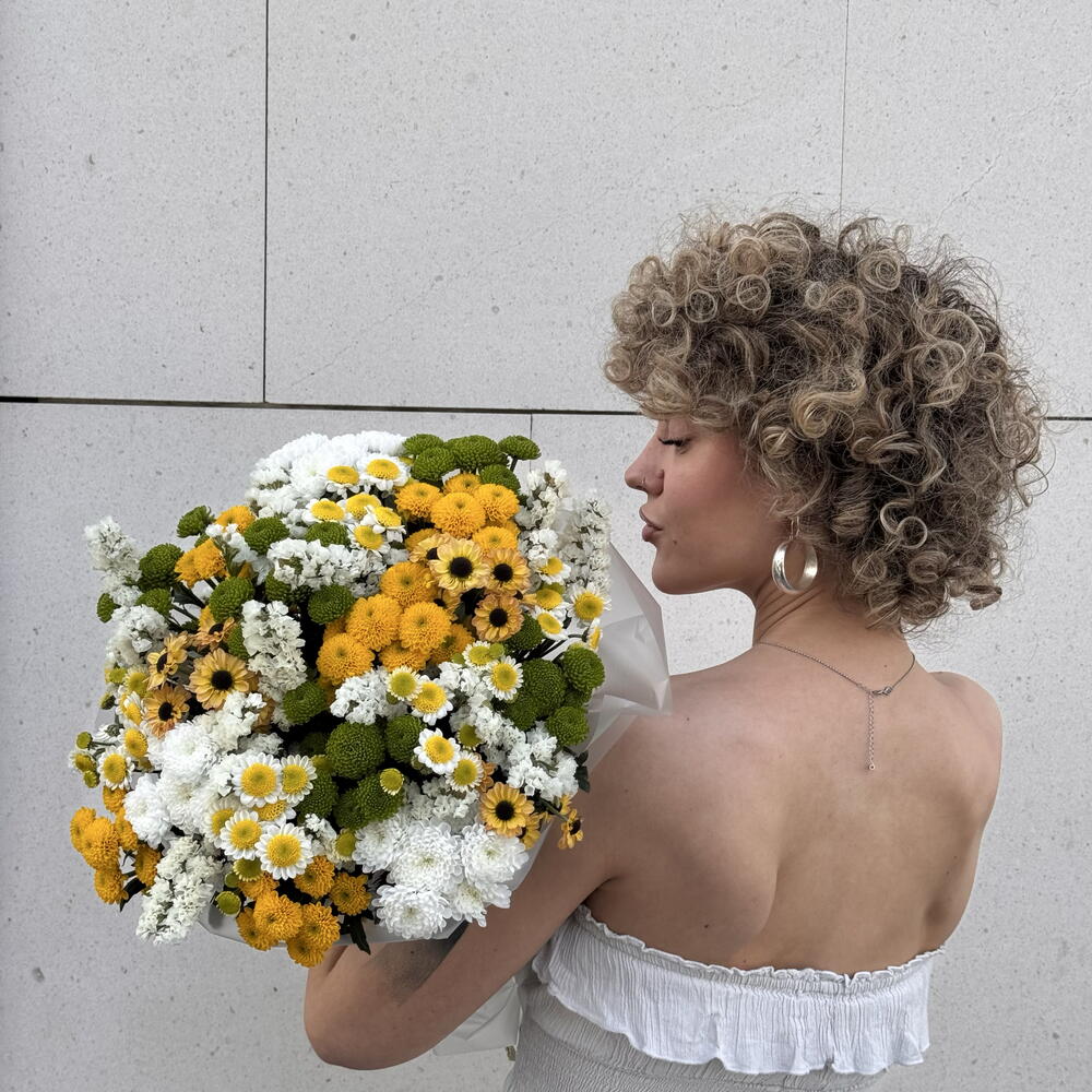 A bright, joy-filled bouquet where yellow and white flowers combine with fresh touches of green to create a harmonious, natural composition. It brings warmth and positive energy to any space, perfect as a gift or to celebrate a special moment. A delicate yet eye-catching choice that leaves a lasting impression.