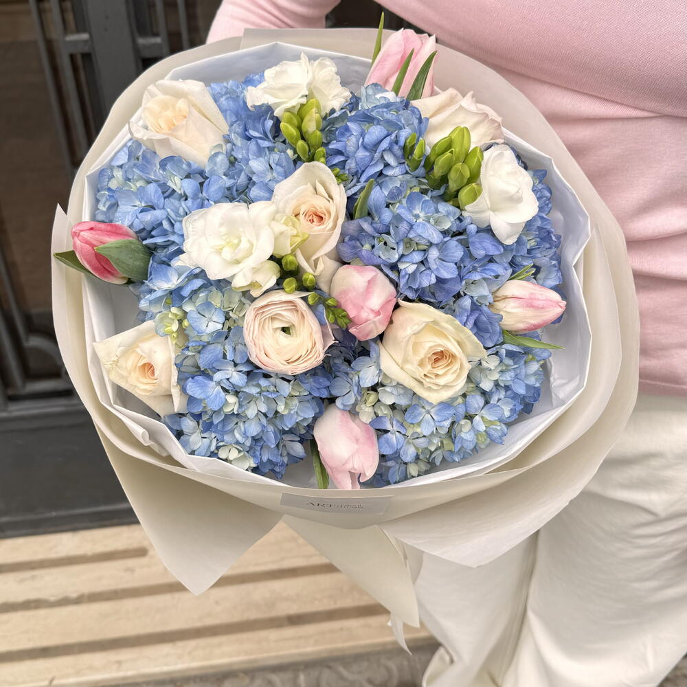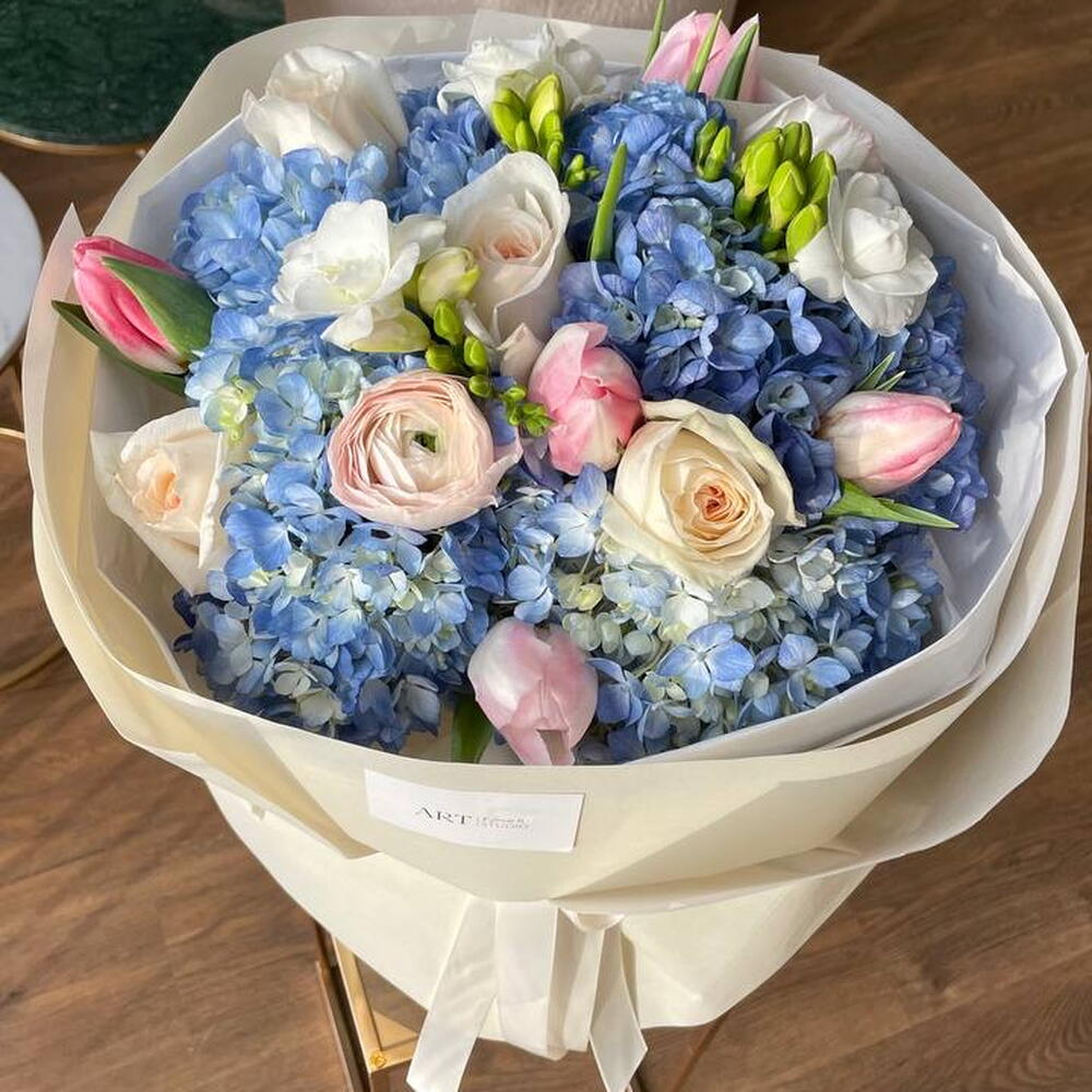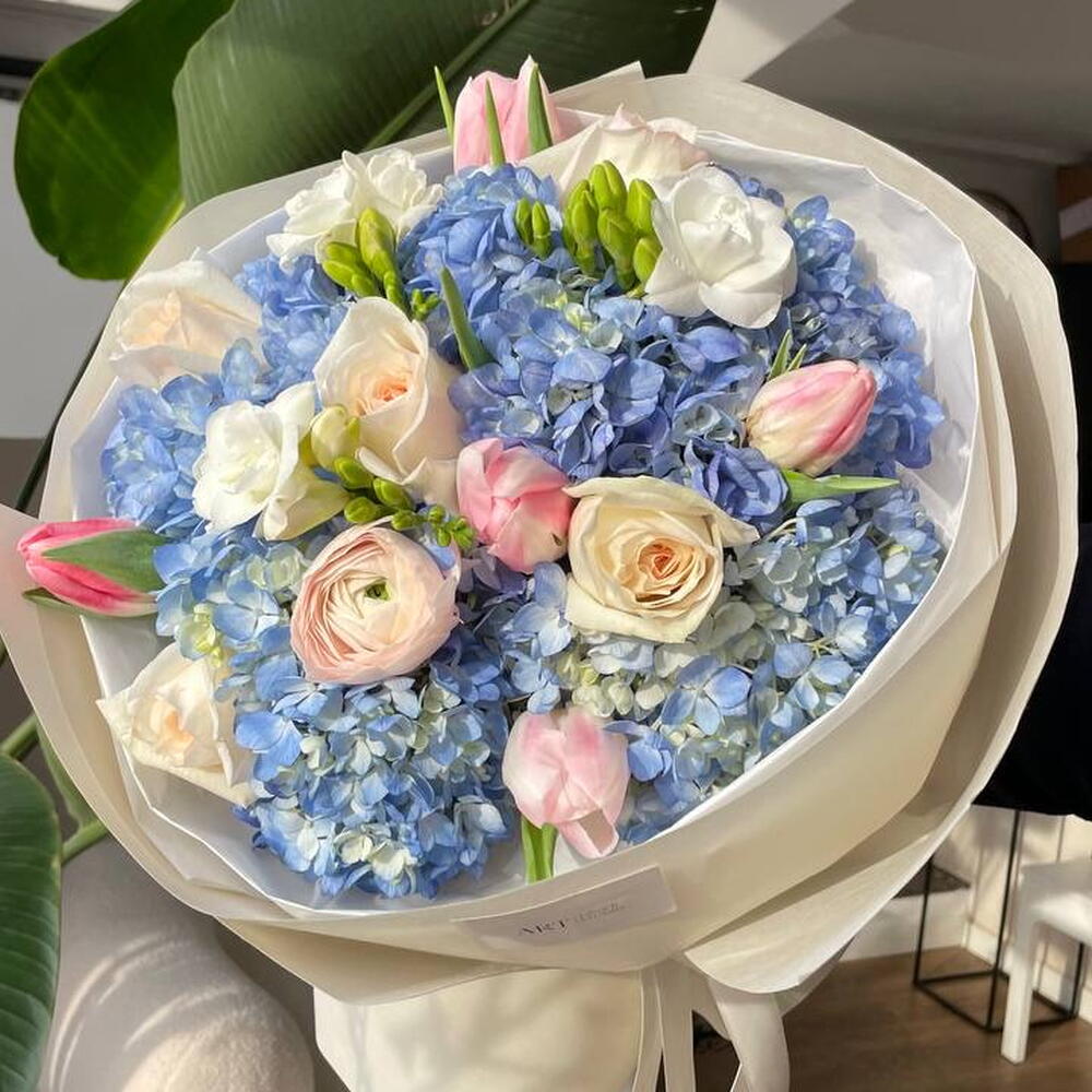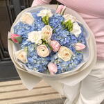 Tulips - 5 pcs Freesia - 3 pcs hydrangea - 3 pcs ranunculus - 1 pcs ohara - 4 pcs