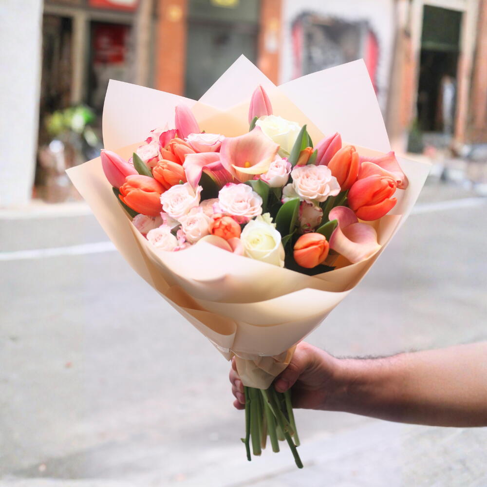 This magnificent floral arrangement from the De Autor category consists of an exquisite and elegant blend of flowers. It includes 5 charming calla lilies, 10 vibrant tulips and 2 eternal white roses, accompanied by 3 elegant spray roses. A combination full of color and delicacy, perfect for any occasion.
