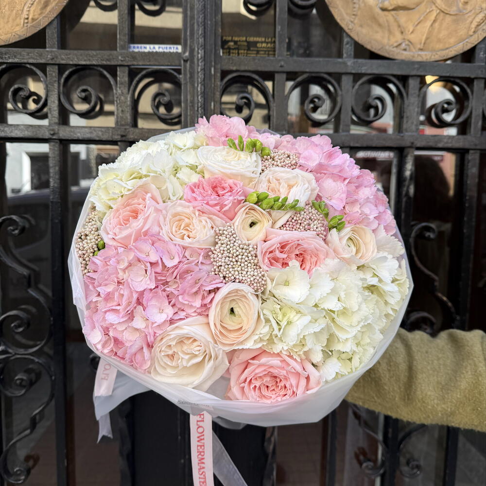 hydrangea - 5 pcs ranunculus - 3 pcs ohara - 3 pcs fresia white - 4 pcs arroz - 4 pcs rosa princess crown - 5 pcs