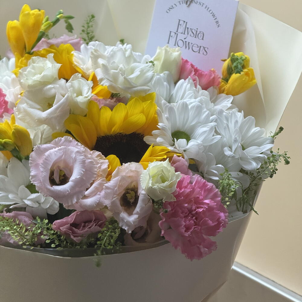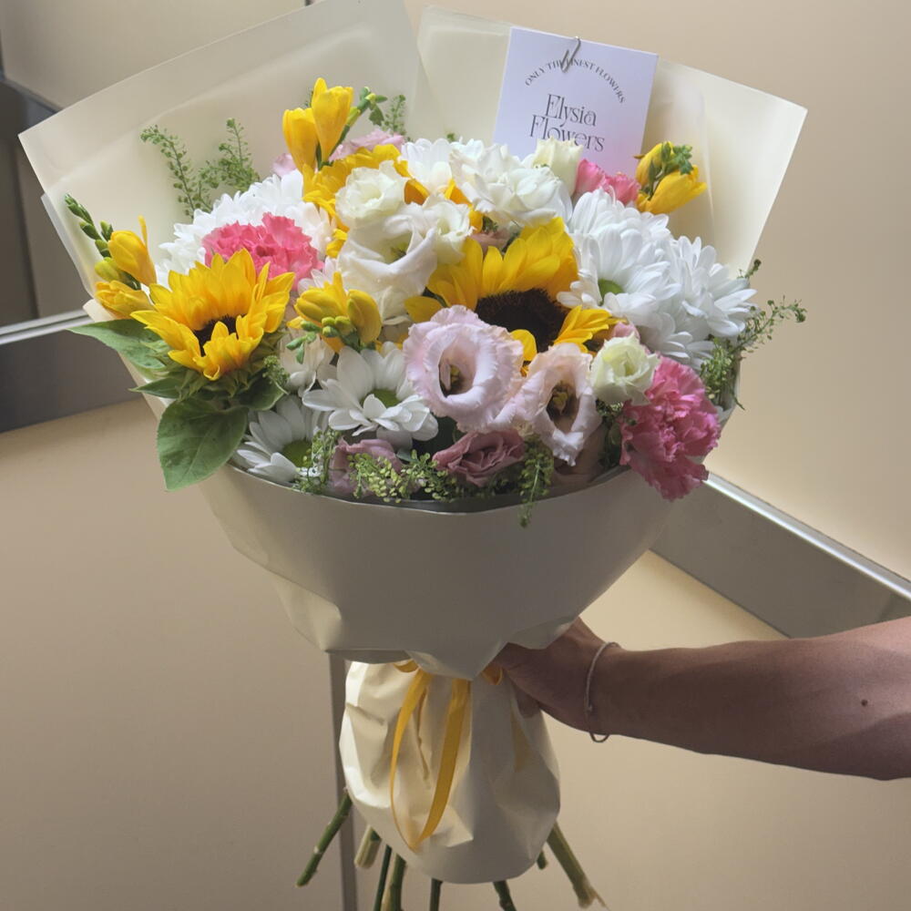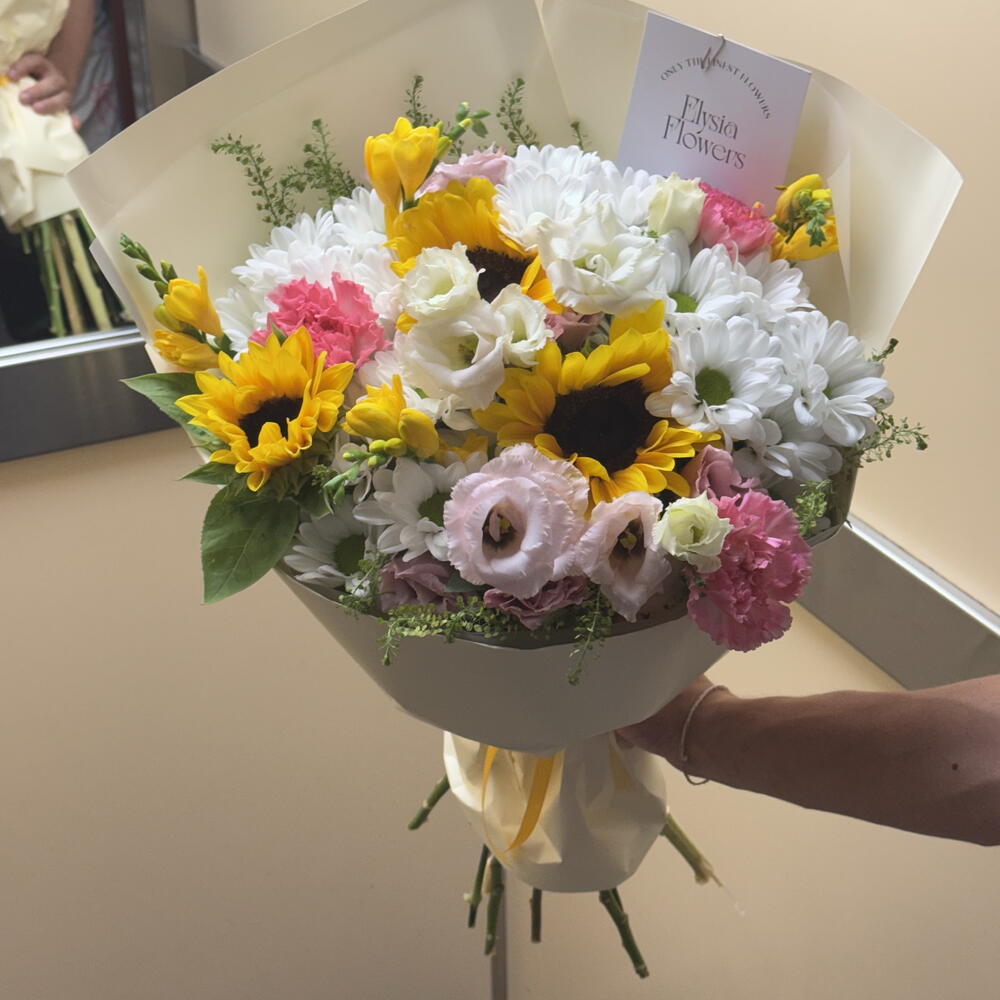 Sunny and joyful bouquets with a mix of fresh summer flowers, will bring happiness to anyone. In Elysia flowers we aim to care about you and provide you with the best service. All our bouquets include a guide for home care, flower food and possibility of personalisation. We hope your experience goes smoothly and you receive the best product possible.