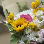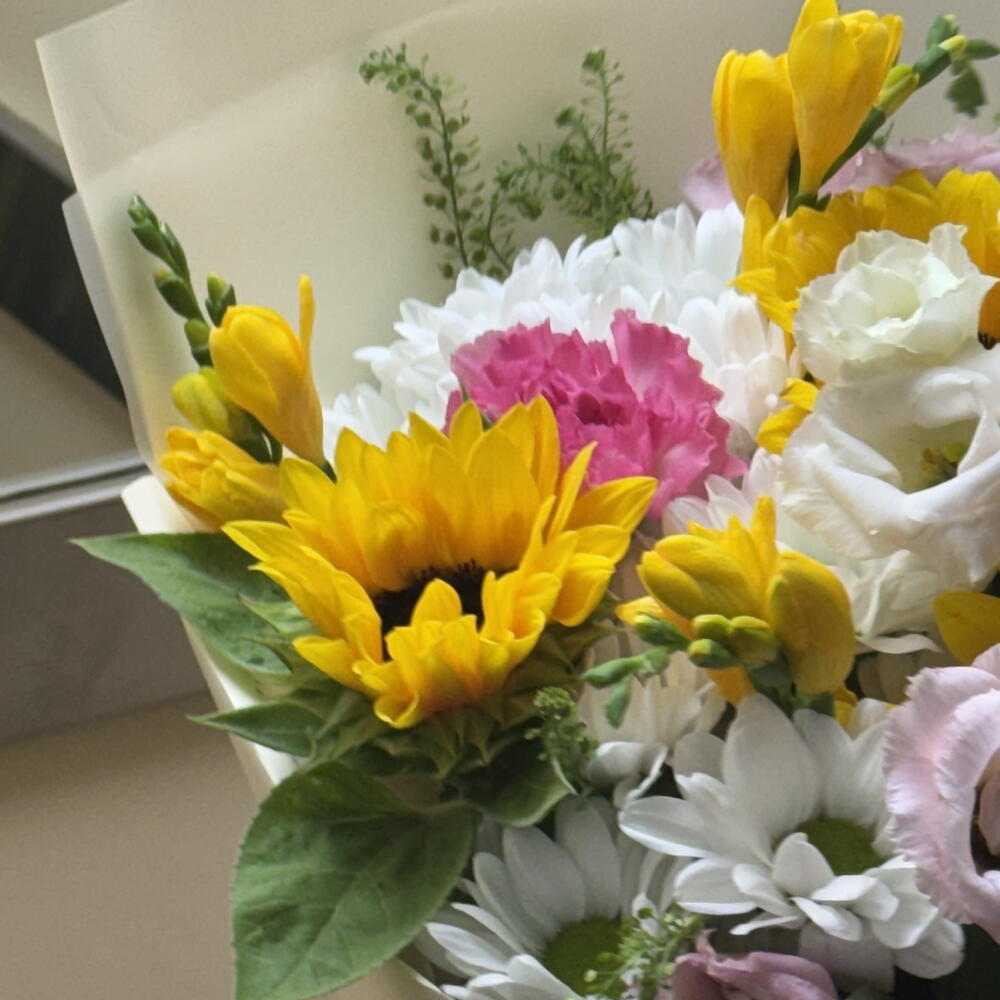 Greenery - 5 pcs Chrysanthemum - 4 pcs Freesia - 4 pcs Lisianthus - 3 pcs dianthus - 3 pcs girasoles - 3 pcs flower food - 1 pcs