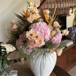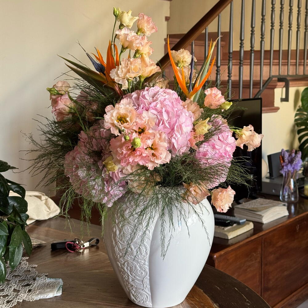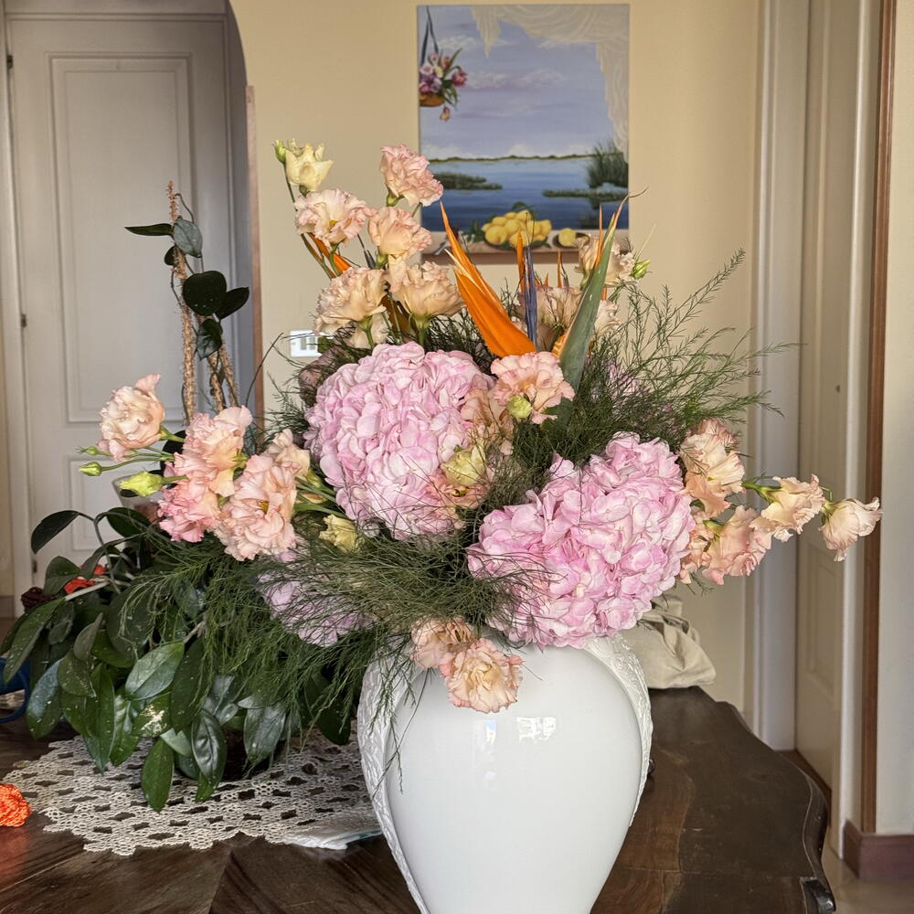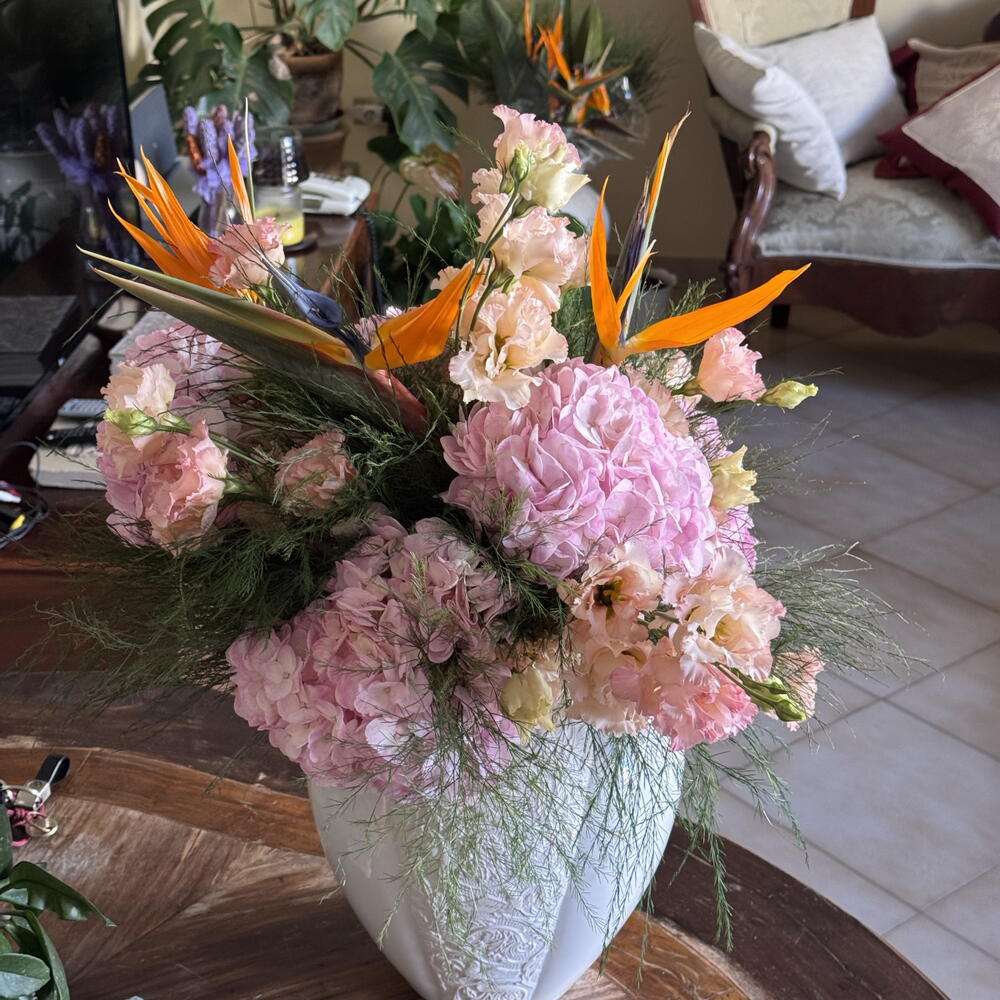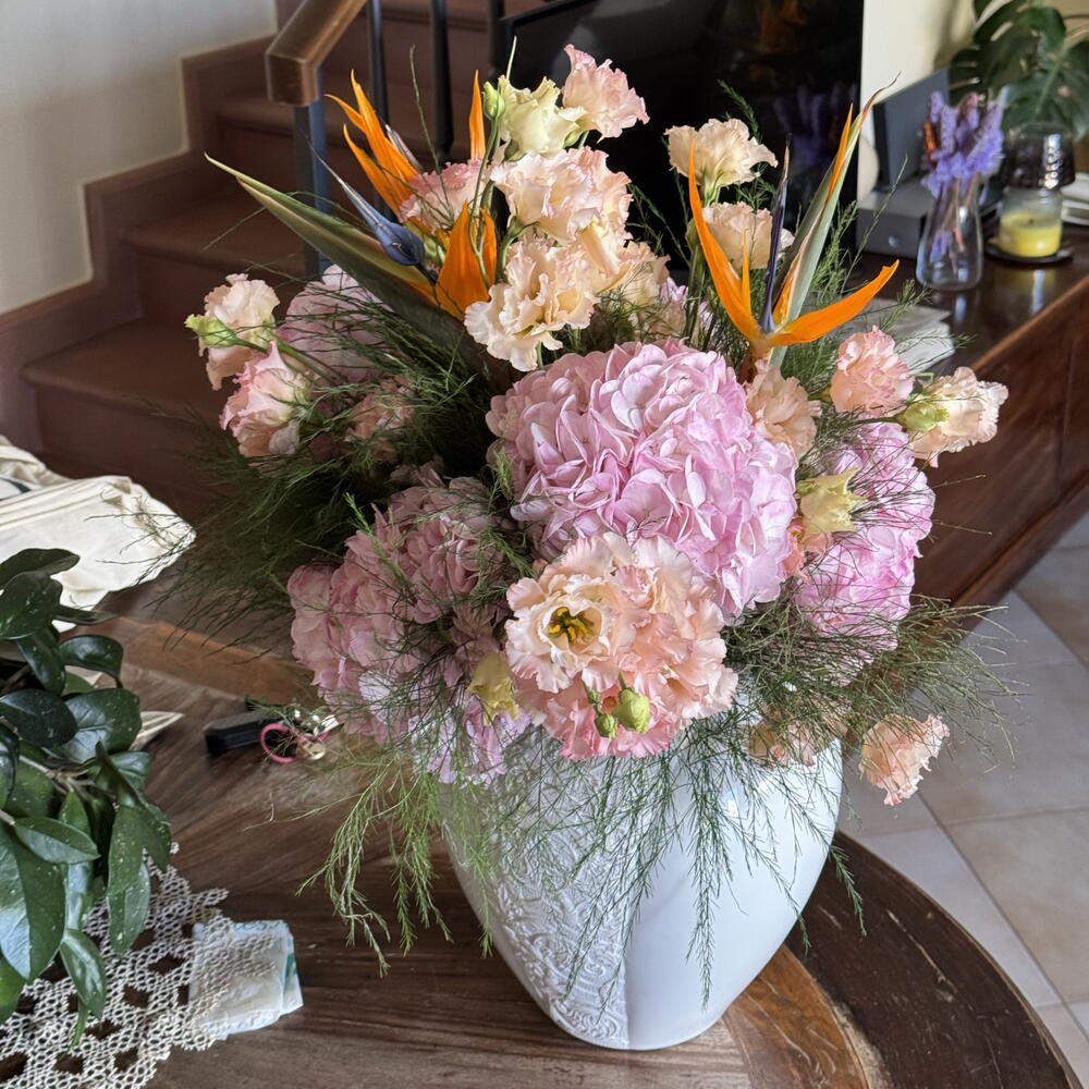 Greenery - 6 pcs hortensia - 5 pcs Lisianthus - 10 pcs Vase - 1 pcs strelitzia - 3 pcs