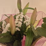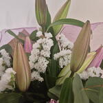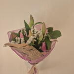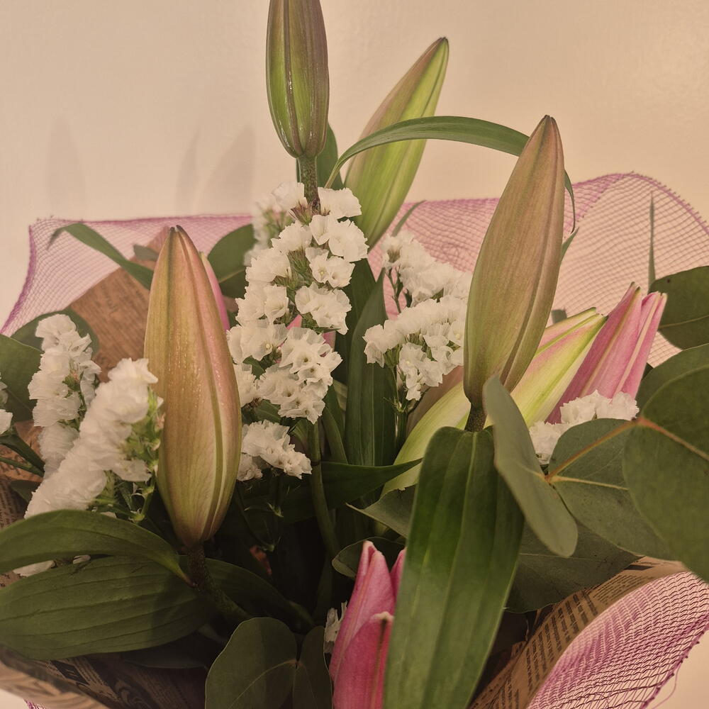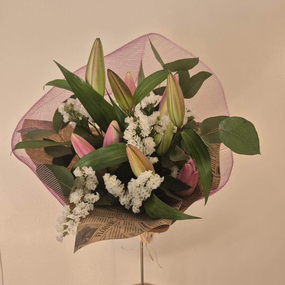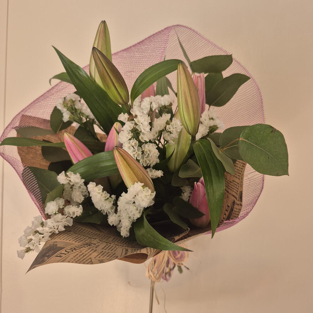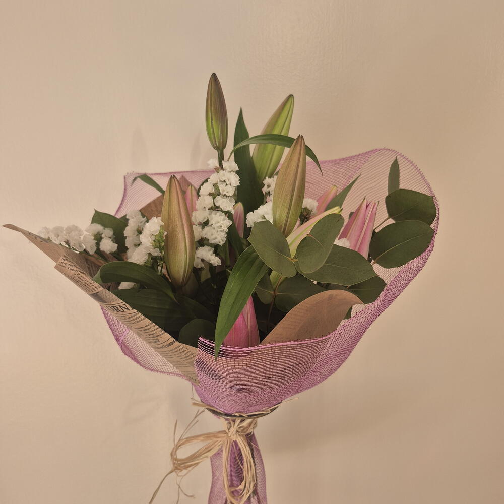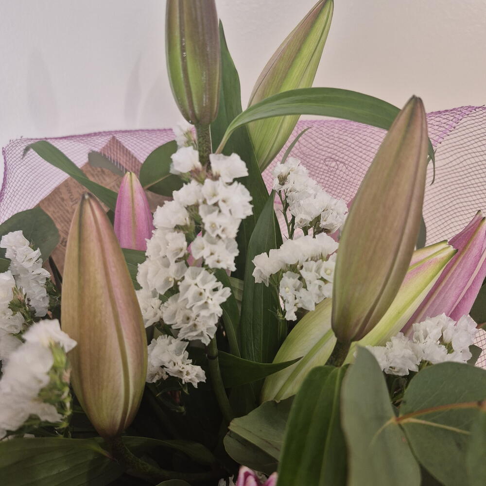 Natural-style bouquet with a romantic and contemporary air, composed of lilies in pink tones, white statice and fresh greenery such as eucalyptus. Presented with textured wrapping in rosé tones and kraft paper, creating a delicate, elegant piece full of harmony.