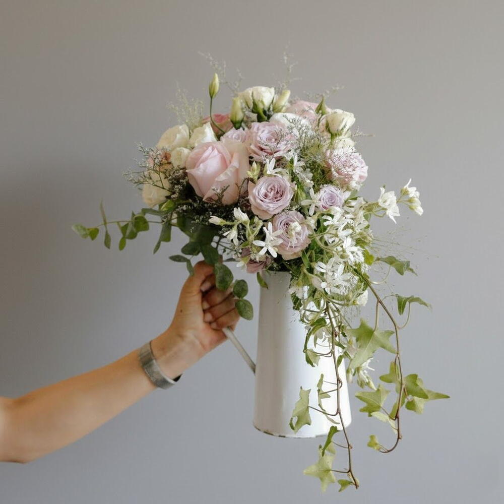 Este delicado ramo combina tonos suaves de rosa y lila que transmiten romanticismo y elegancia. Las rosas y la eustoma crean un volumen aterciopelado, mientras que las flores blancas y el follaje colgante aportan ligereza y movimiento. Es un arreglo perfecto para cumpleaños, aniversarios, bodas íntimas, declaraciones románticas o como un gesto refinado de agradecimiento. Su estilo natural y ligeramente silvestre lo convierte en un detalle decorativo ideal para cualquier espacio. Para mantener su frescura, coloca el ramo en un lugar fresco, evita la luz solar directa y cambia el agua cada dos días. También es recomendable cortar los tallos en diagonal antes de volver a colocarlos en el agua y retirar las hojas que queden sumergidas.