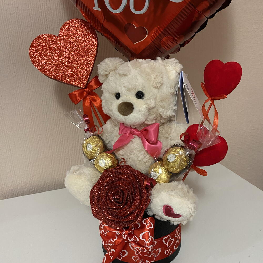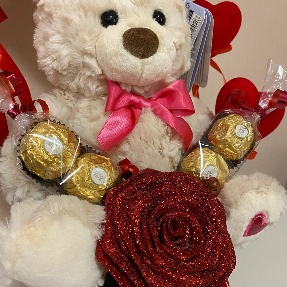 Ferrero rocher - 4 pcs plush teddy bear - 1 pcs decorative box - 1 pcs eternal rose - 1 pcs i love you balloon - 1 pcs handmade heart - 1 pcs decor heart - 2 pcs