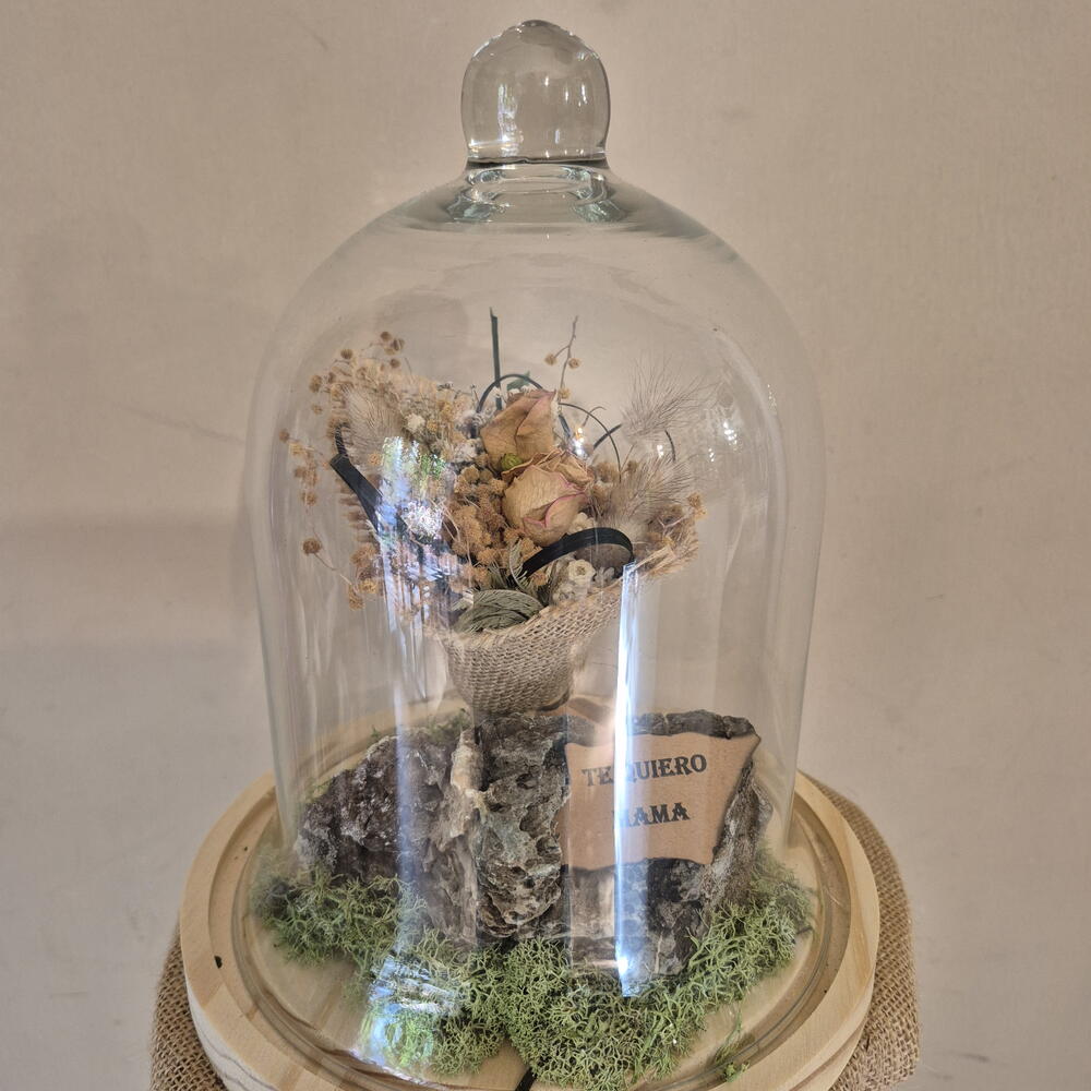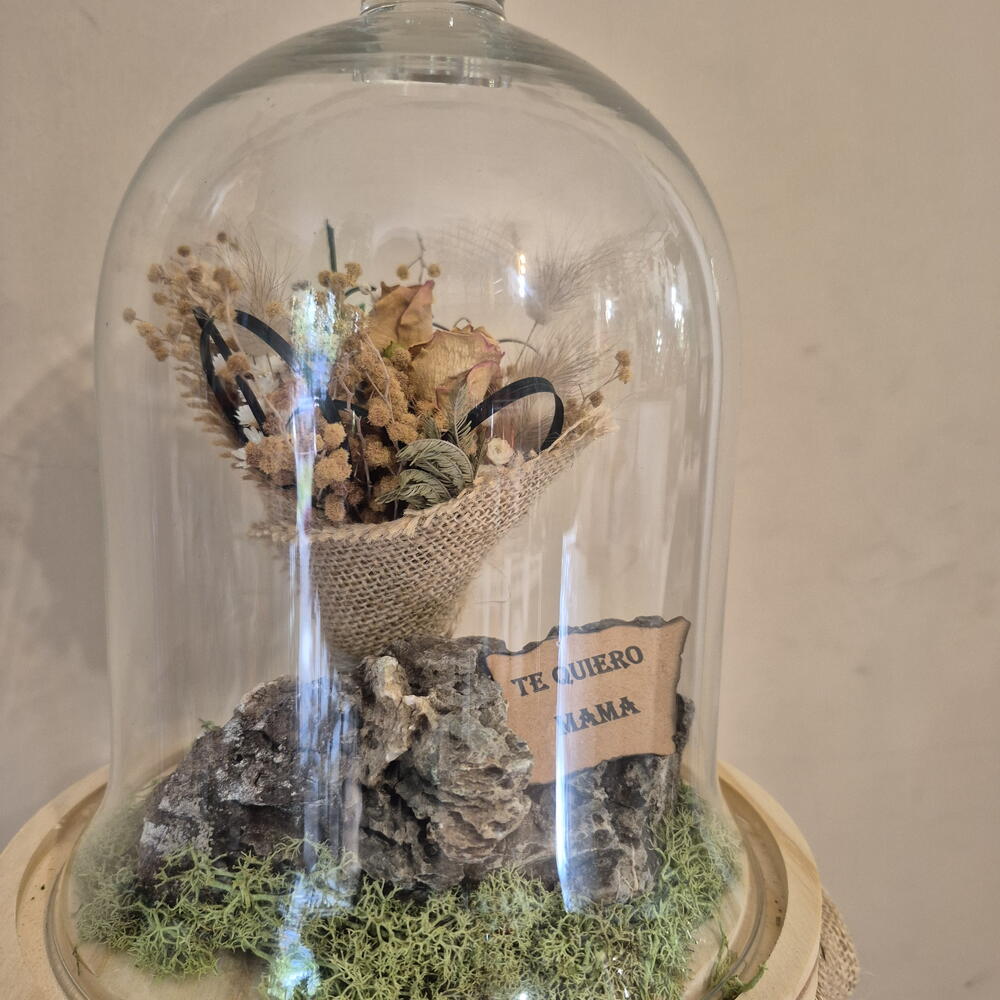 This magnificent signature arrangement features a mini bouquet of freeze-dried flowers surrounded by preserved moss, artistically presented in a transparent glass dome. We add a geode stone to this striking ensemble to give it a distinctive touch. Additionally, the set comes with a dedication card to personalize your message. This product is the perfect combination of art, nature and sentiment, designed to add a touch of beauty to any setting.