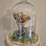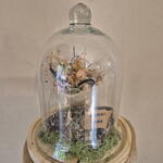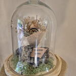 preserved moss - 1 pcs transparent glass dome - 1 pcs geode stone - 1 pcs dedication card - 1 pcs small preserved rose - 3 pcs preserved mimosa branch - 1 pcs burlap - 1 pcs