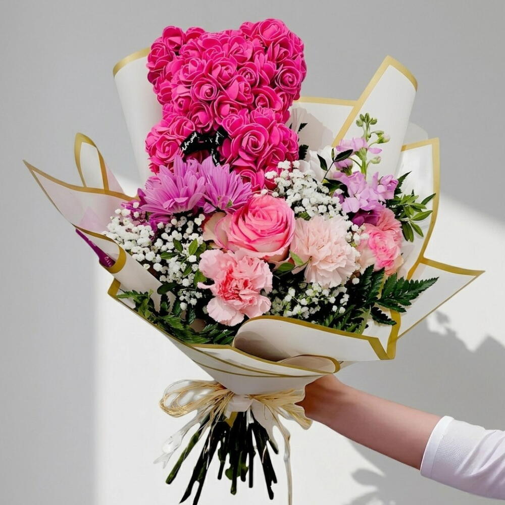 A unique bouquet that combines fresh flowers in shades of white and purple with a charming rose bear in pastel pink. This special design is perfect for expressing love and tenderness on any memorable occasion. Ideal for gifting on anniversaries, birthdays, or as a romantic gesture.