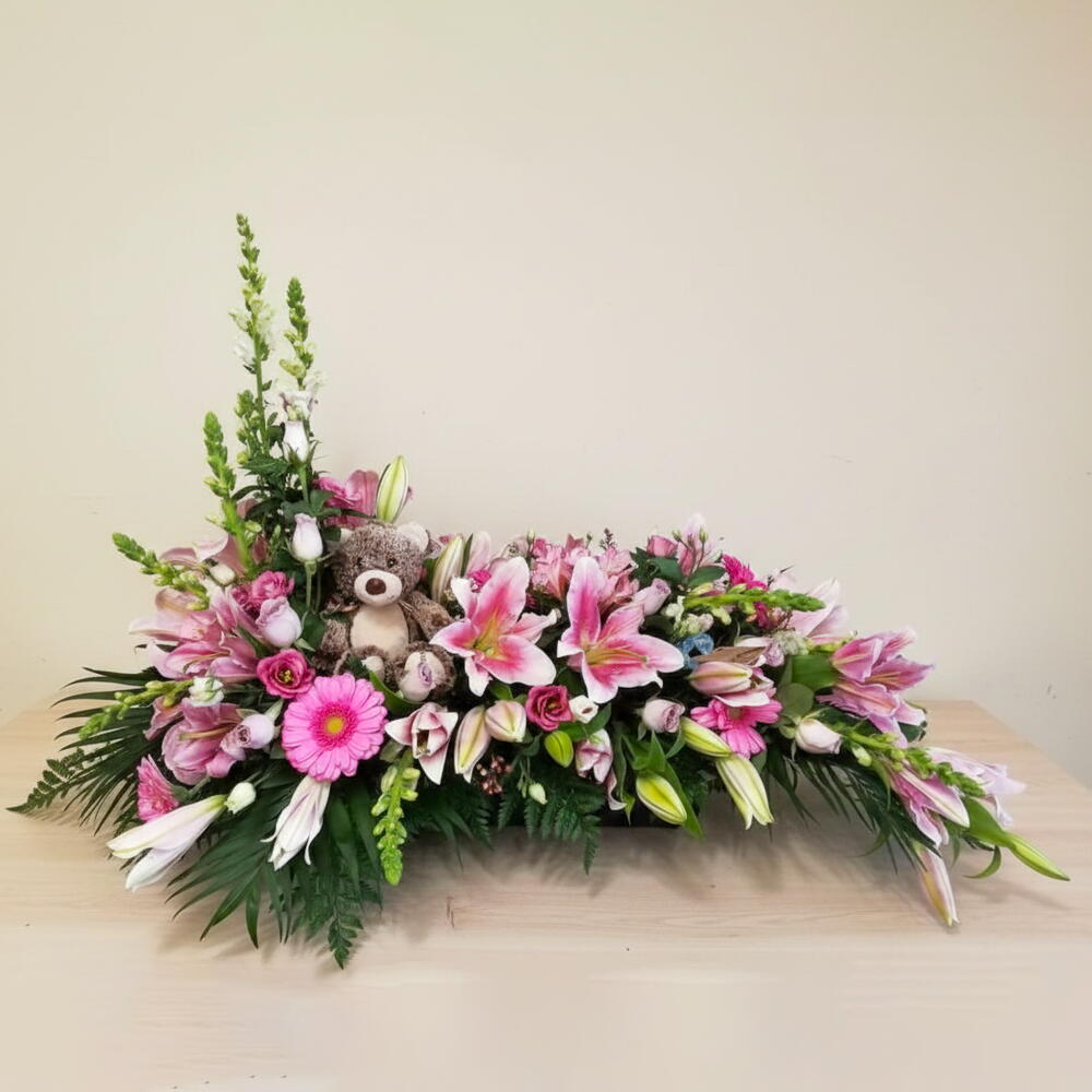 The arrangement “Ternura Rosada” is a sweet explosion of love and delicacy, ideal for welcoming a new baby or celebrating a special occasion with tenderness. Its pink lilies, open and in bud, fill the room with a soft fragrance, while the roses and gerberas bring joy and color. The small plush teddy bear in the center adds a charming touch that will make anyone smile. Each flower has been lovingly selected to convey warmth, purity and affection. It is the perfect gift for a maternity, a child's birthday or to express sincere love. A harmonious combination of flowers and tenderness that leaves a mark on the heart.
