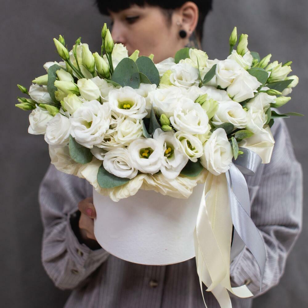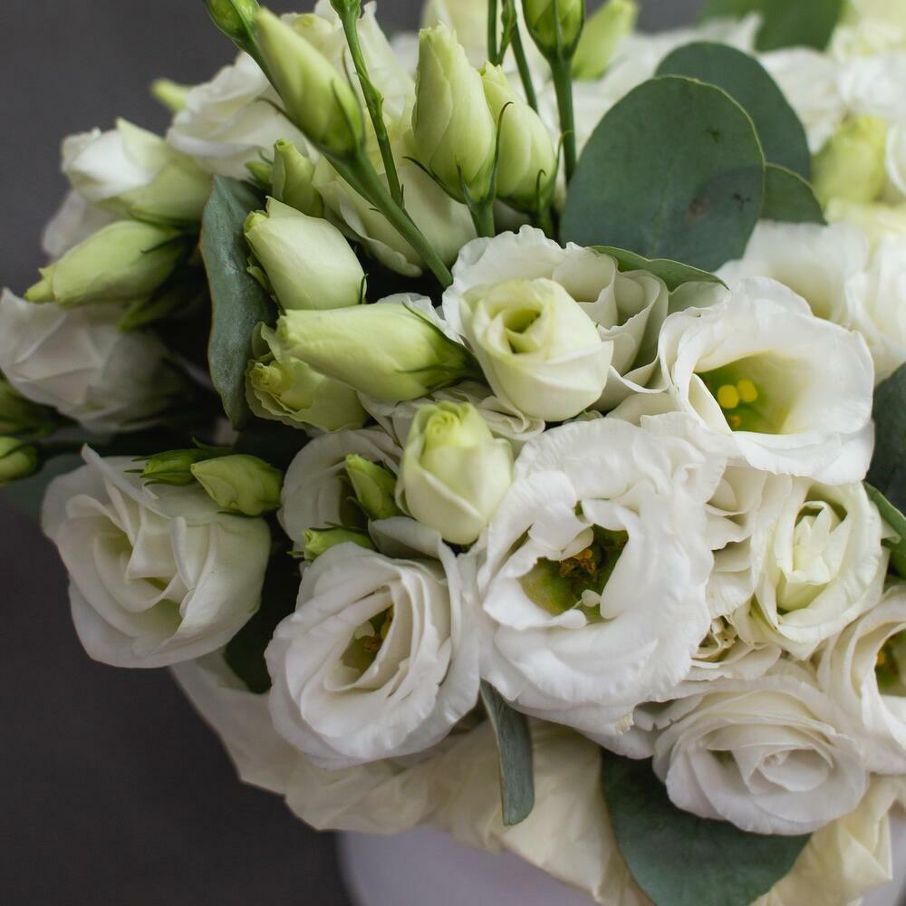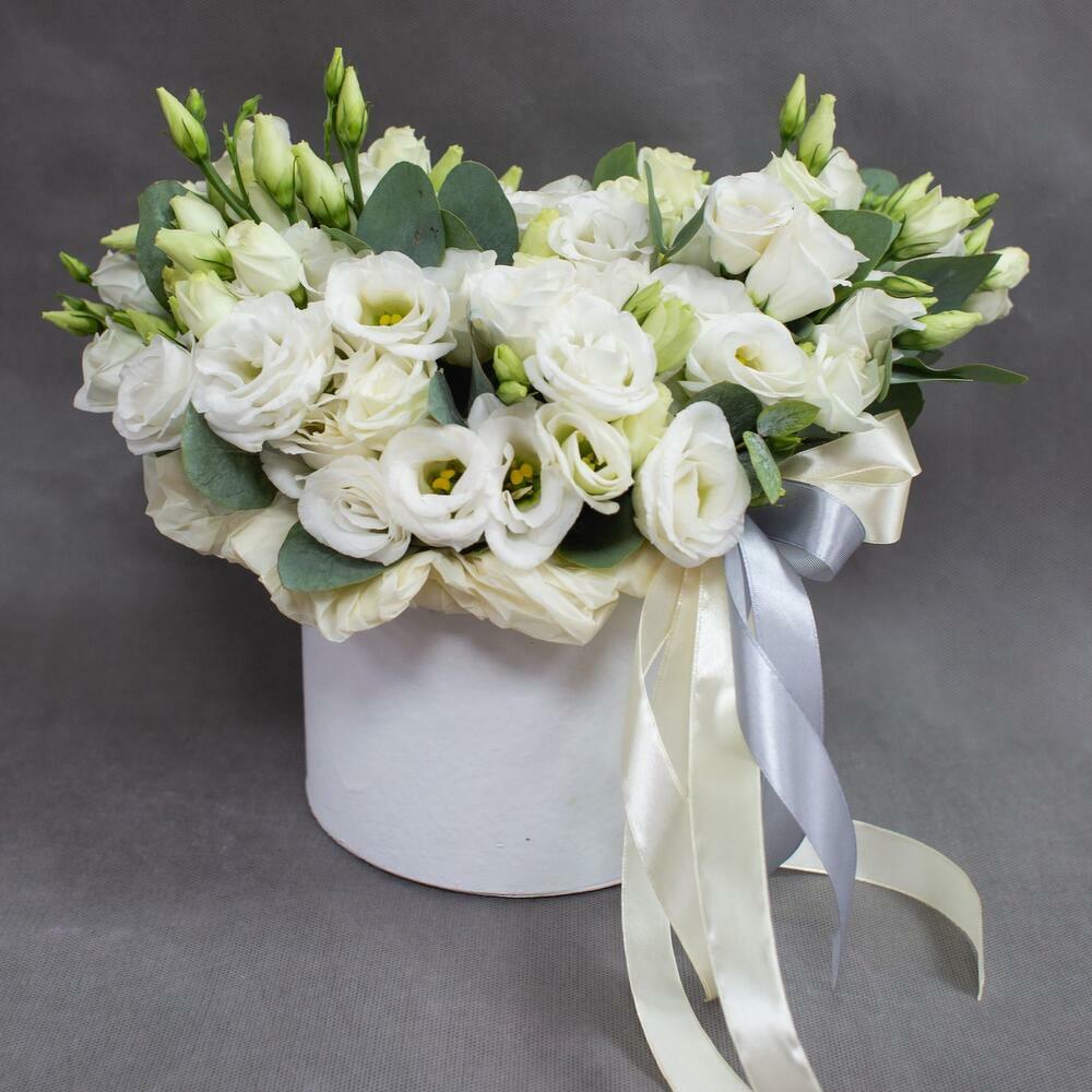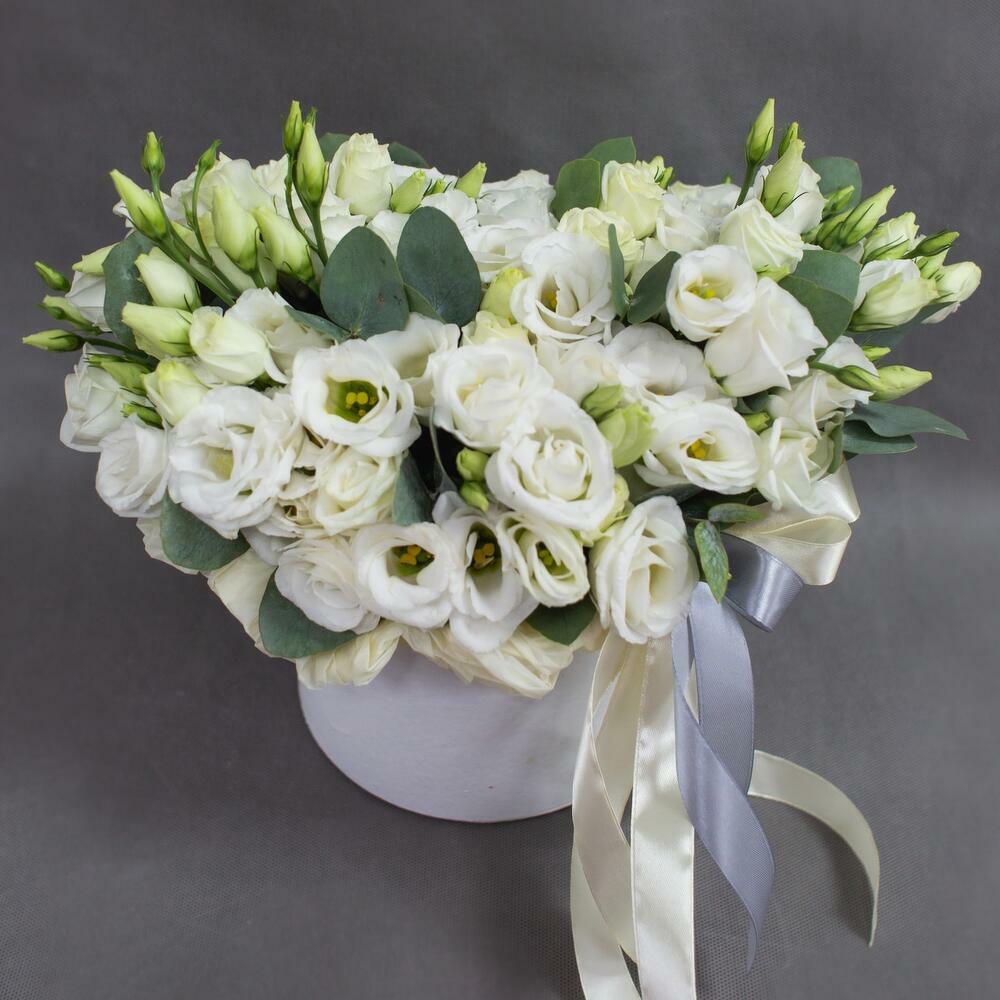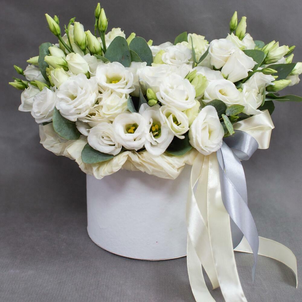 Satin ribbon - 1 pcs Eucalyptus - 2 pcs lisianthus blanco - 10 pcs caja - 1 pcs
