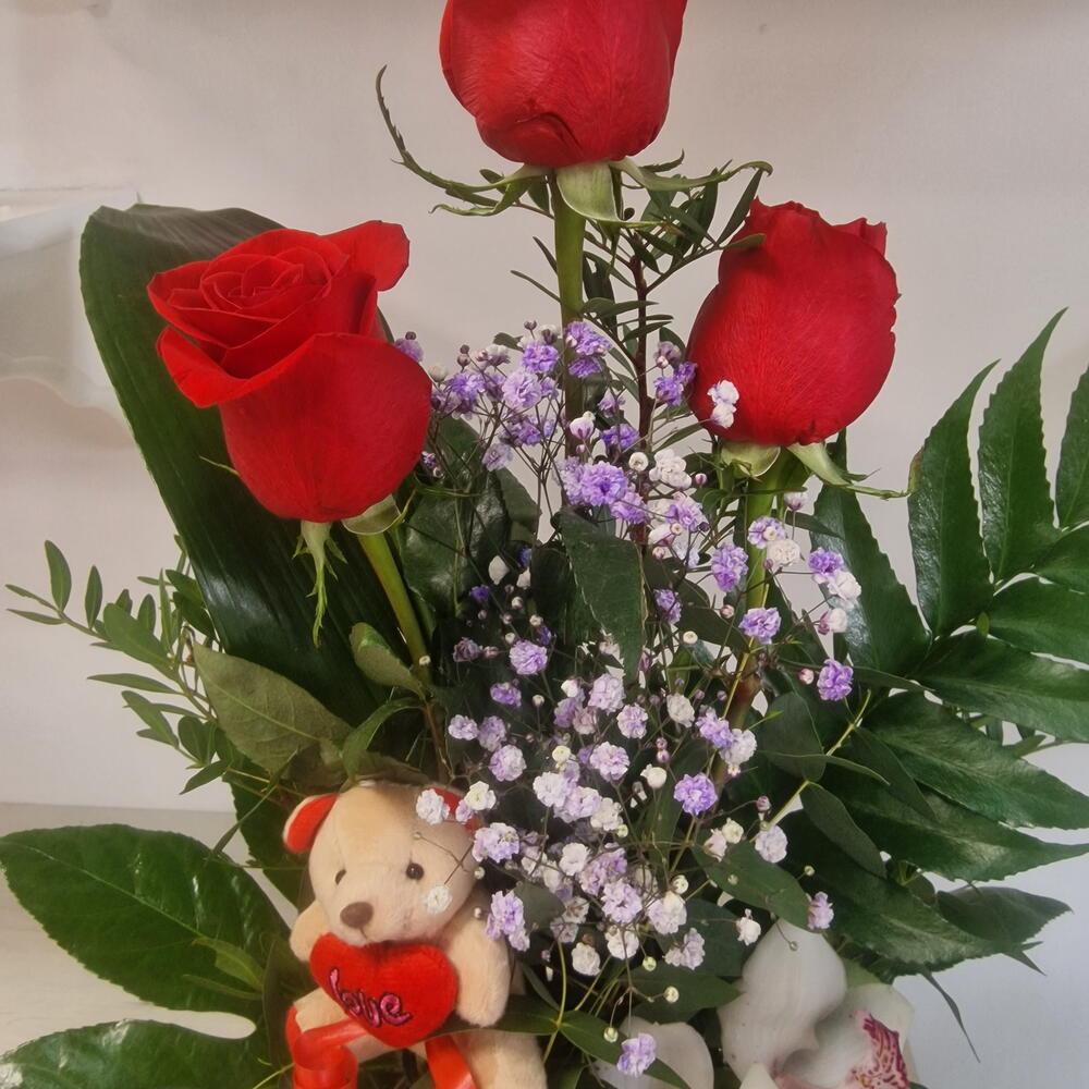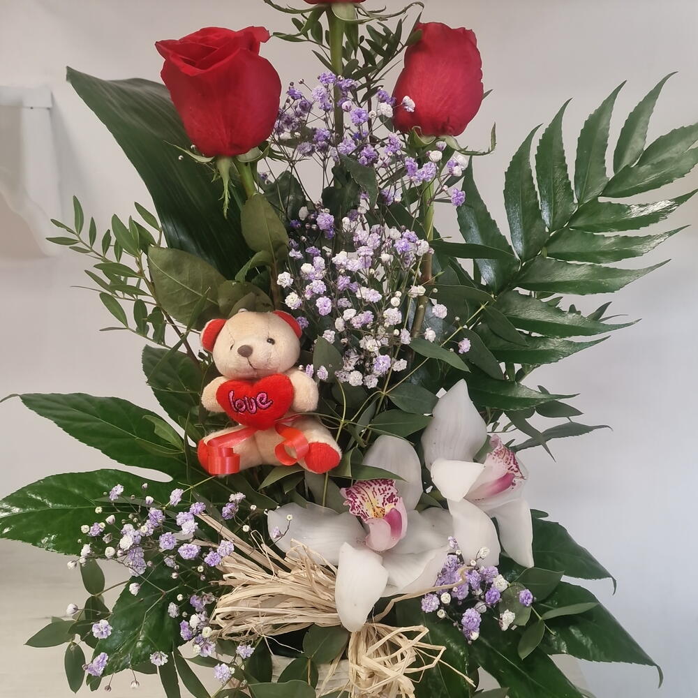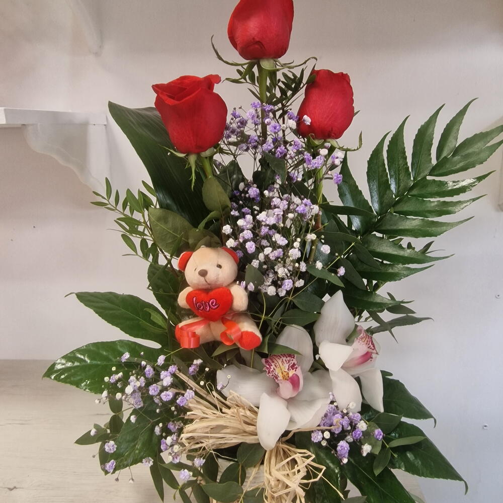 Sweet Trio Centerpiece composed of 3 fresh roses, an orchid accent and a plush teddy bear. A balanced combination of natural flowers and a tender detail. The roses provide the classic touch, the orchid adds distinction, and the teddy bear adds a note of affection. Ideal for thanking, congratulating or saying “I thought of you” in a simple and lovely way. Perfect as a gift for birthdays, anniversaries, births or simply to surprise.