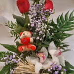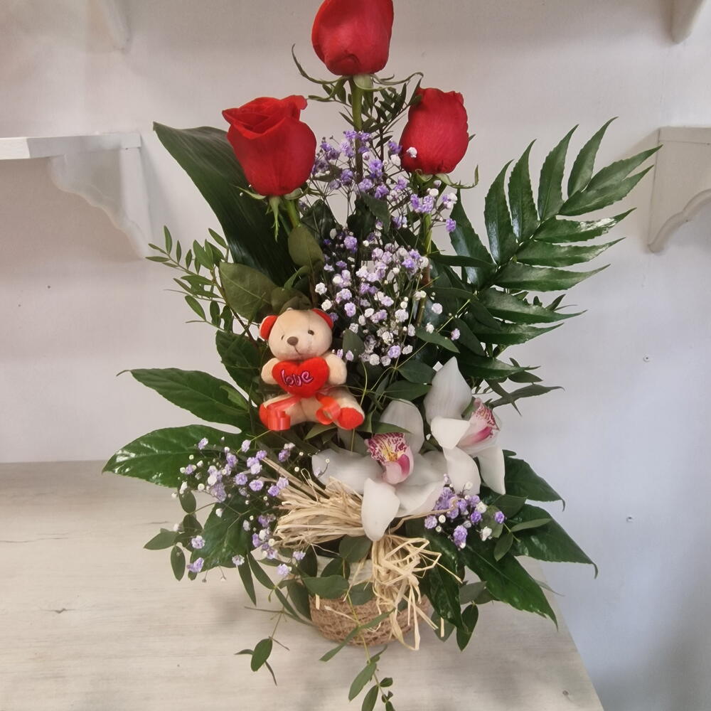 verdes variados - 5 pcs osito de peluche - 1 pcs rosa rojas - 3 pcs white orchids - 2 pcs raffia bow - 1 pcs white or colored peniculata - 3 pcs wicker base - 1 pcs