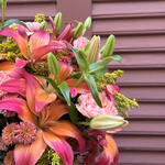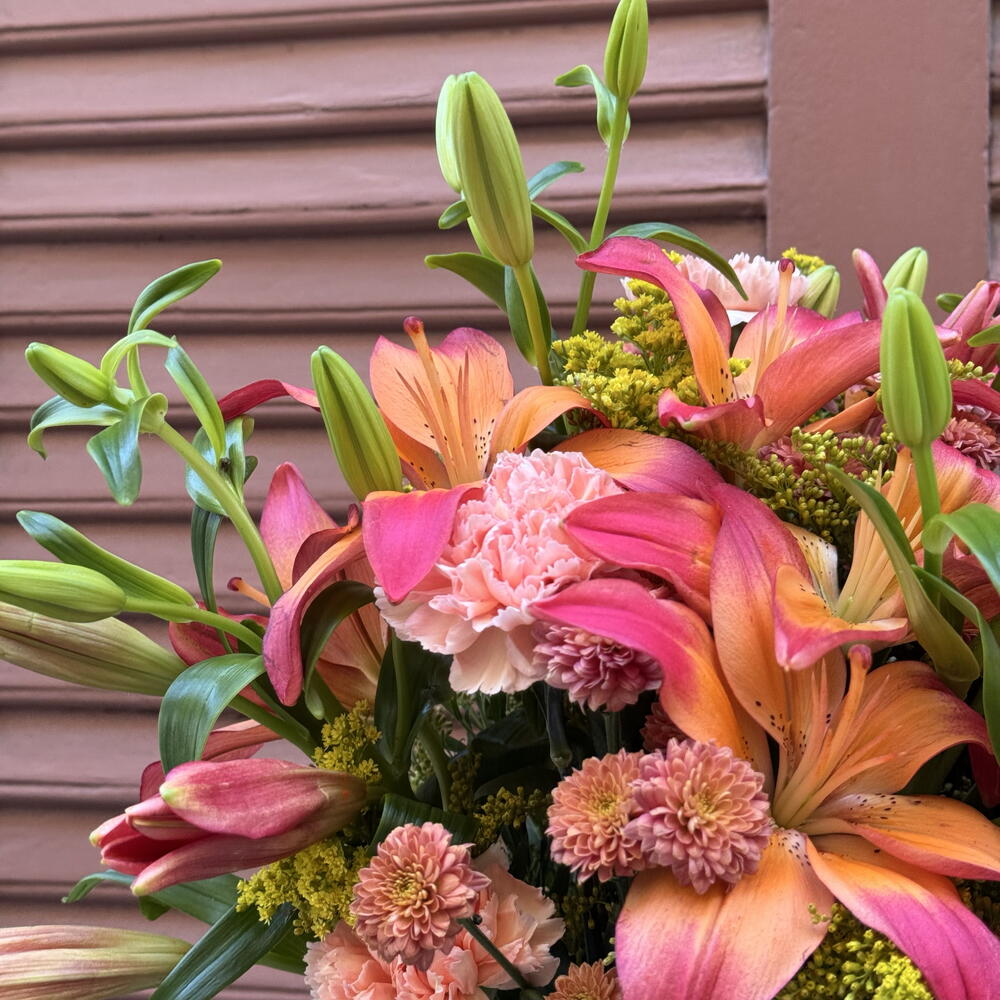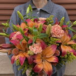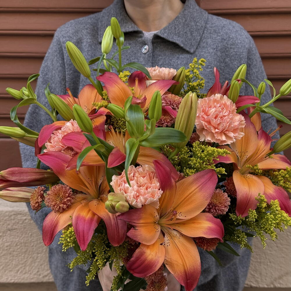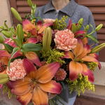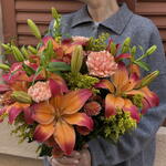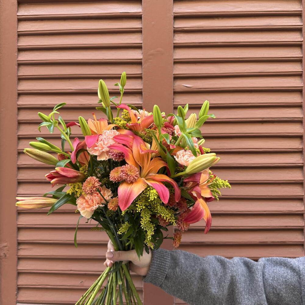 Mixed bouquet with lilies and seasonal flowers in warm tones. A vibrant composition full of energy.