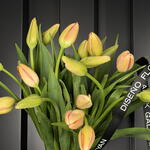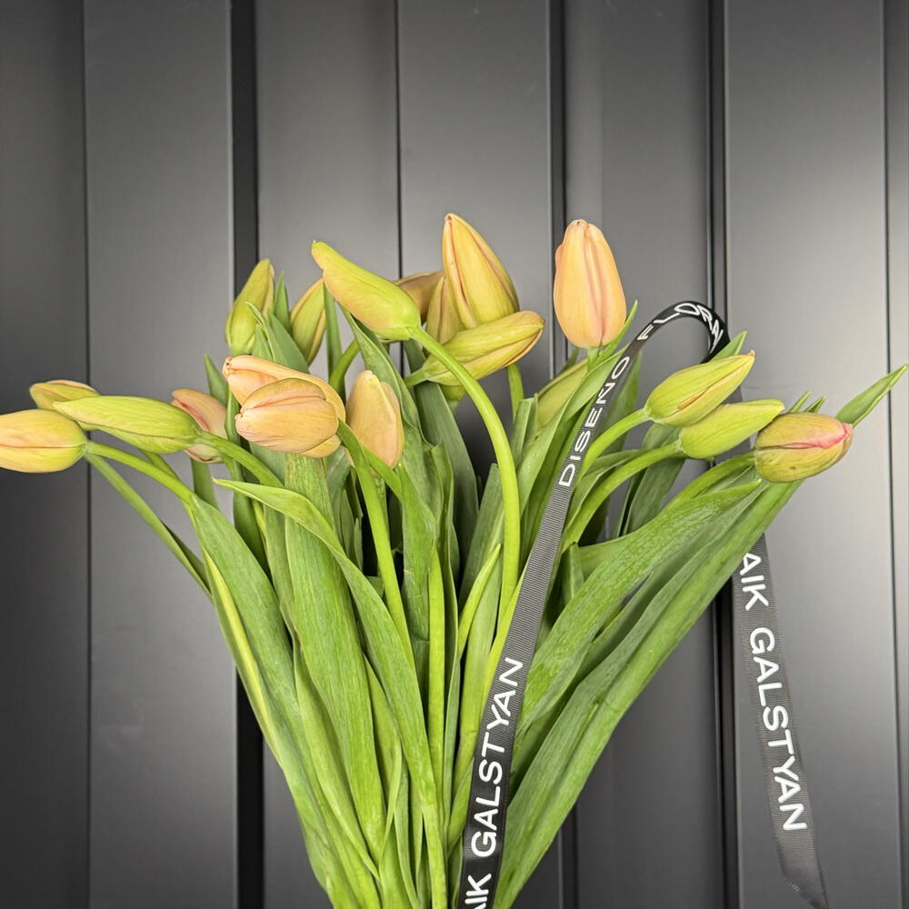 Elegant bouquet of tulips in a soft peach tone, carefully selected in a semi-open state to ensure greater longevity and a spectacular opening at home. Their delicate petals with warm hues contrast with the intense, fresh green of the long leaves, creating a modern and sophisticated arrangement.