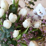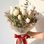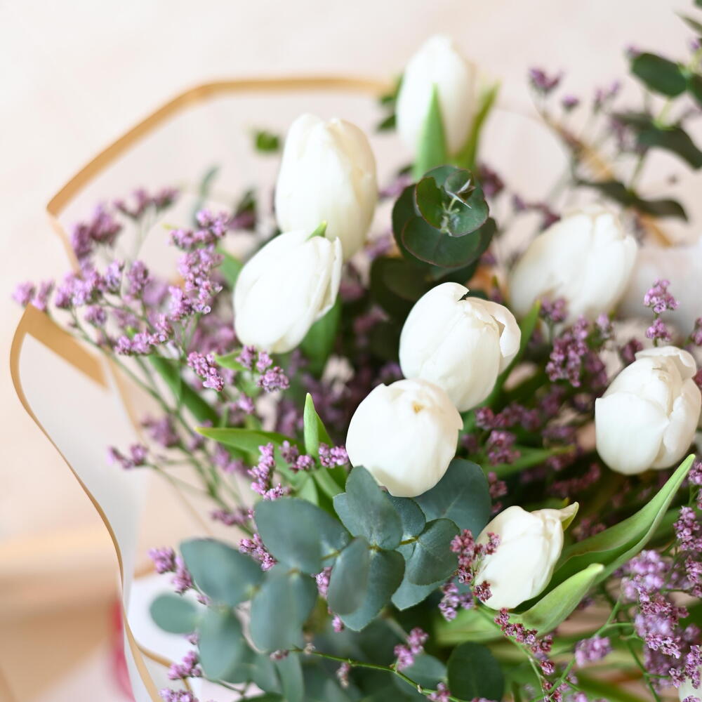 Bouquet of tulips with limonium and eucalyptus, Valentine's Day special with a teddy bear. The color may vary depending on stock