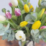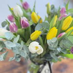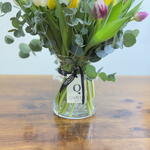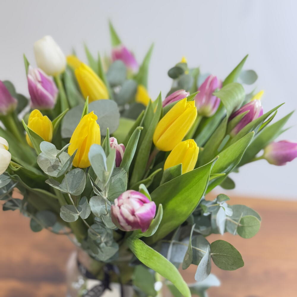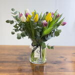 eucalyptus - 5 pcs glass vase - 1 pcs assorted tulips - 51 pcs