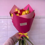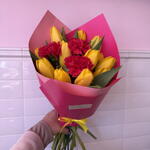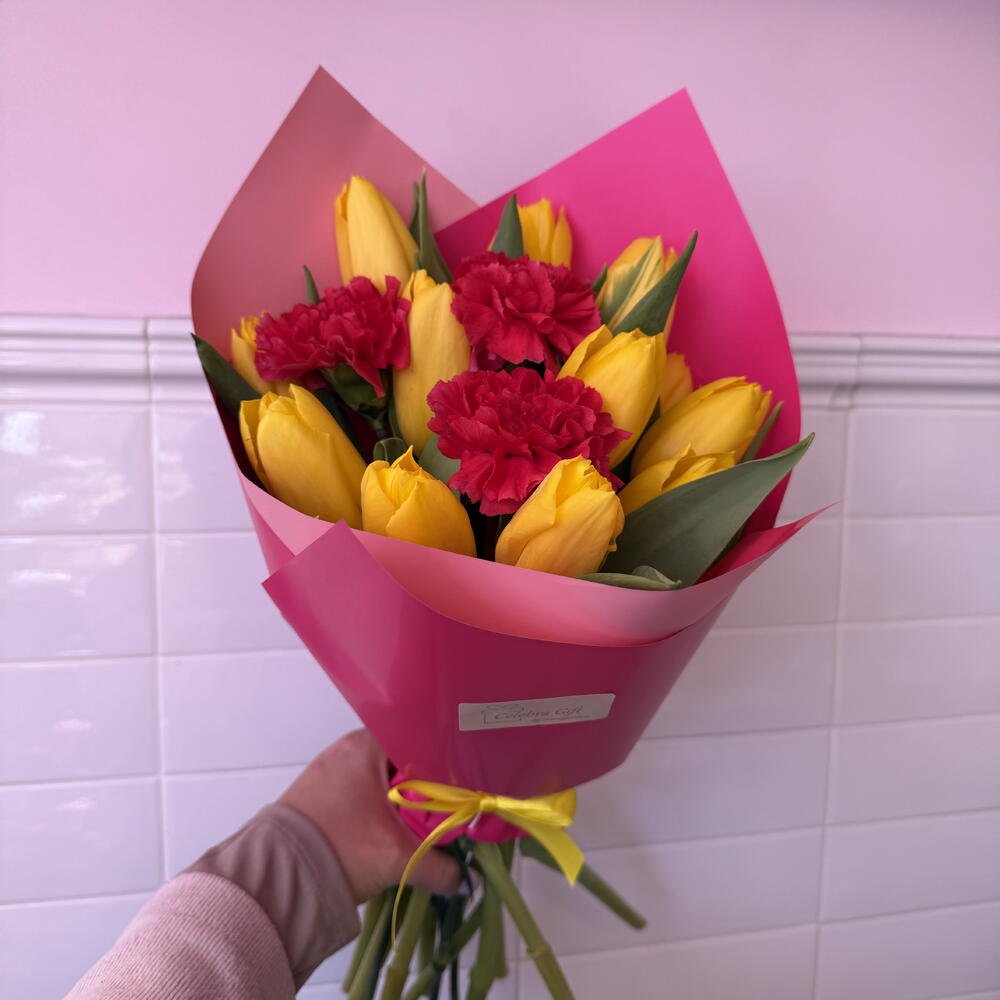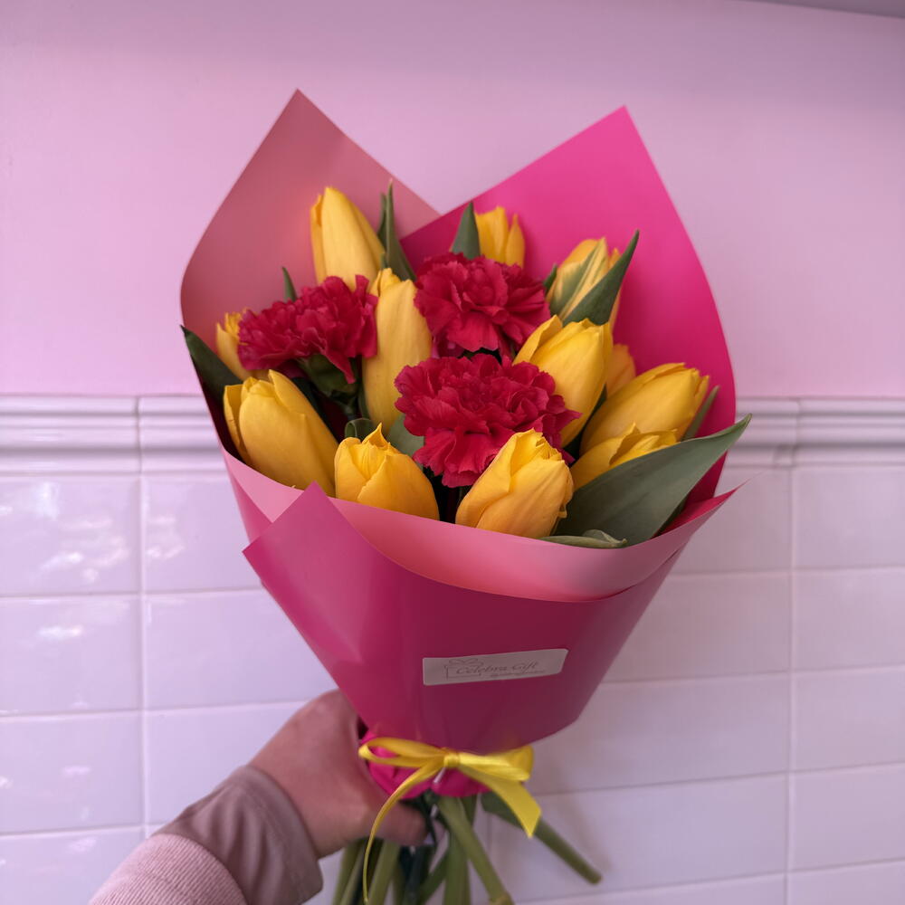 This beautiful signature bouquet consists of twelve radiant tulips and three carnations, along with three vibrant green accents that enhance its natural beauty. The finishing touches, two sheets of paper and decorative ribbons, make it an elegant gift for any occasion. Each flower has been carefully selected to ensure its freshness and beauty. This bouquet is not only a delight for the eyes, but also creates an unforgettable atmosphere of sophistication and elegance.