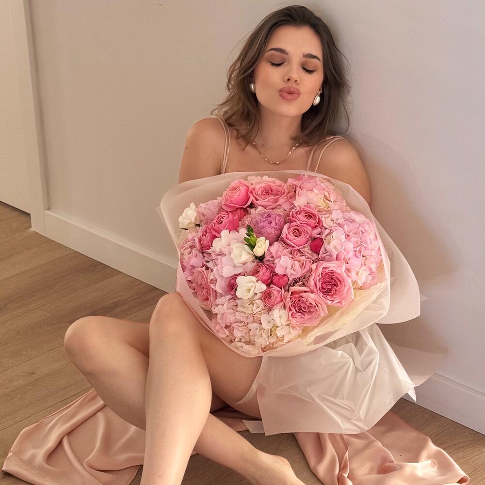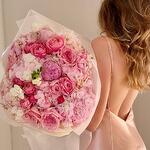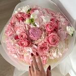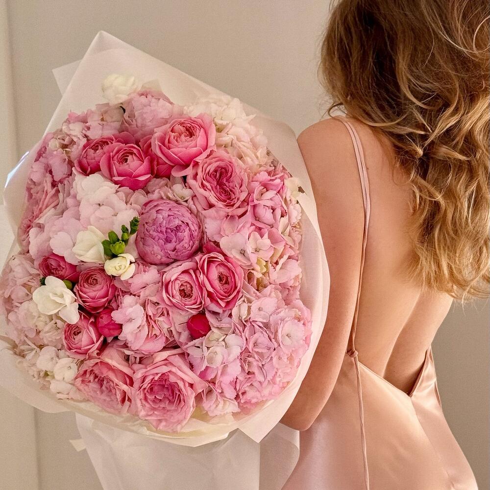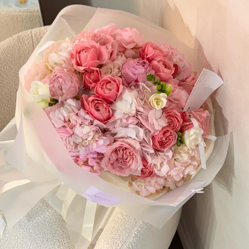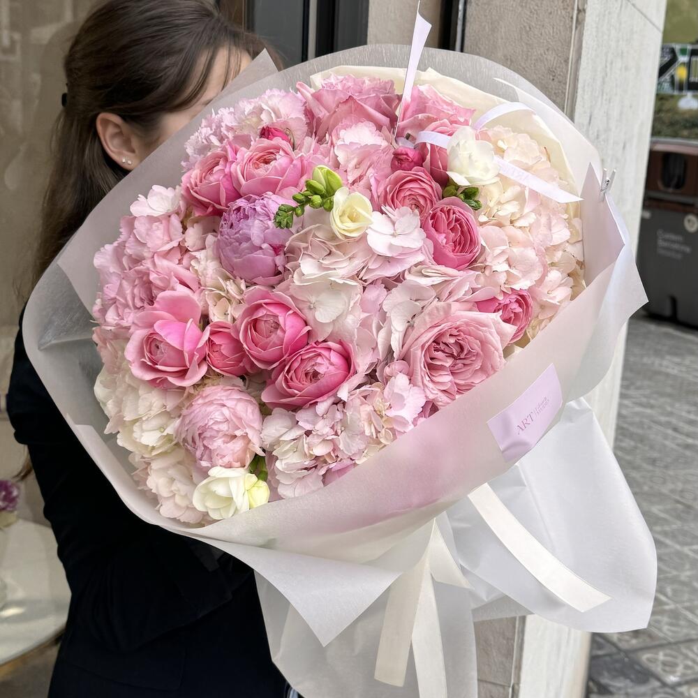 hydrangea - 4 pcs Peony - 5 pcs freesia - 3 pcs roses - 7 pcs
