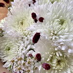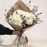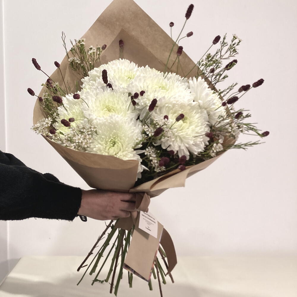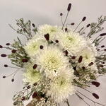 Striking design where white magnum chrysanthemums are the protagonists, accompanied by sanguisorbas that give it a dynamic and vibrant touch. Wax flowers add a romantic touch to the composition. Bouquet ideal for celebrating Christmas or for bringing peace and life to a space. It can be used as a centerpiece in one or several vases. If you want the flowers in a vase, write to us and we'll send you options.
