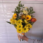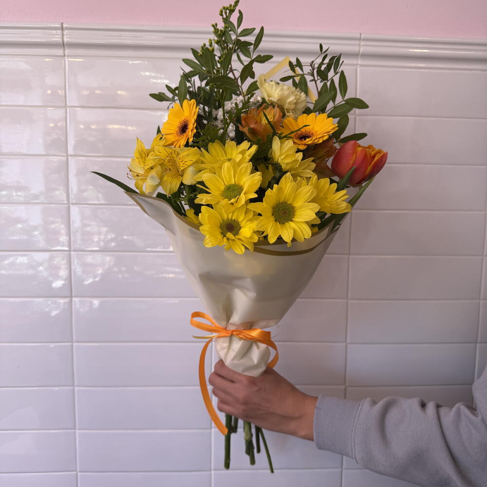 Gerbera - 2 pcs tulips - 1 pcs claveles - 2 pcs astromelias - 2 pcs various greens - 2 pcs multi-flowered daisy - 1 pcs paper and decorative boots - 2 pcs