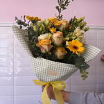 Statice - 3 pcs Gerbera - 2 pcs Lisianthus - 2 pcs roses - 4 pcs mini roses - 2 pcs various greens - 3 pcs paper and decorative ribbons - 1 pcs