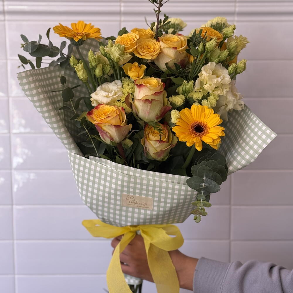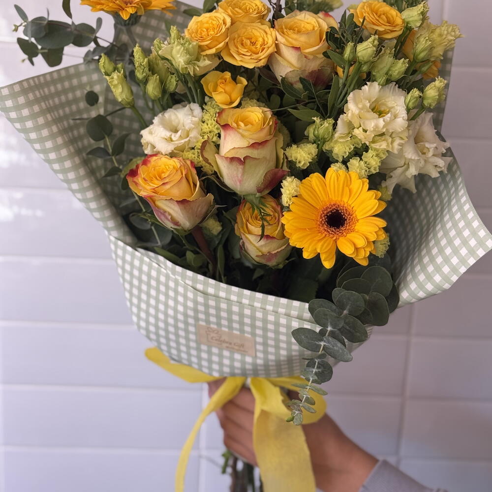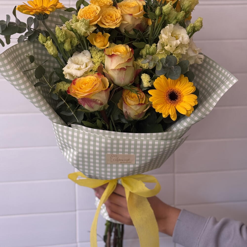 Statice - 3 pcs Gerbera - 2 pcs Lisianthus - 2 pcs roses - 4 pcs mini roses - 2 pcs various greens - 3 pcs paper and decorative ribbons - 1 pcs