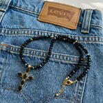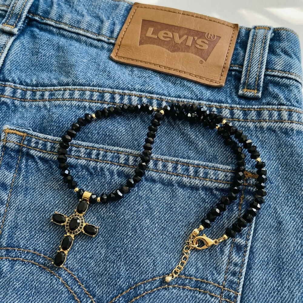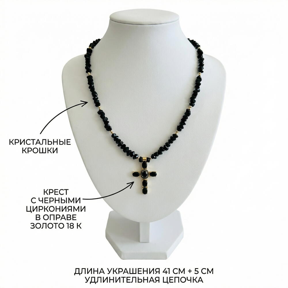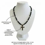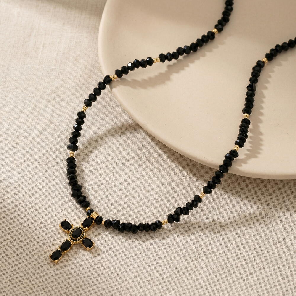 Black geometric Czech crystal necklace with a deep, fascinating tone. The cross-shaped pendant is adorned with sparkling zirconia stones and gold elements that highlight the mysterious shine of the dark base. The play of light on the surface creates a layered sparkle effect, making the decoration austere and spectacular. ✔️ High-quality, hypoallergenic hardware with 18 K gold plating ✔️ Metal jewelry cord ✔️ Pendant with cubic zirconia inlays ✔️ 6 mm black geometric crystal beads ✔️ Product length 40 cm + 5 cm extension chain The decoration comes in gift wrapping and a pouch, ready to gift or store it safely. Original work, handmade. And that means you won't run into anyone else.