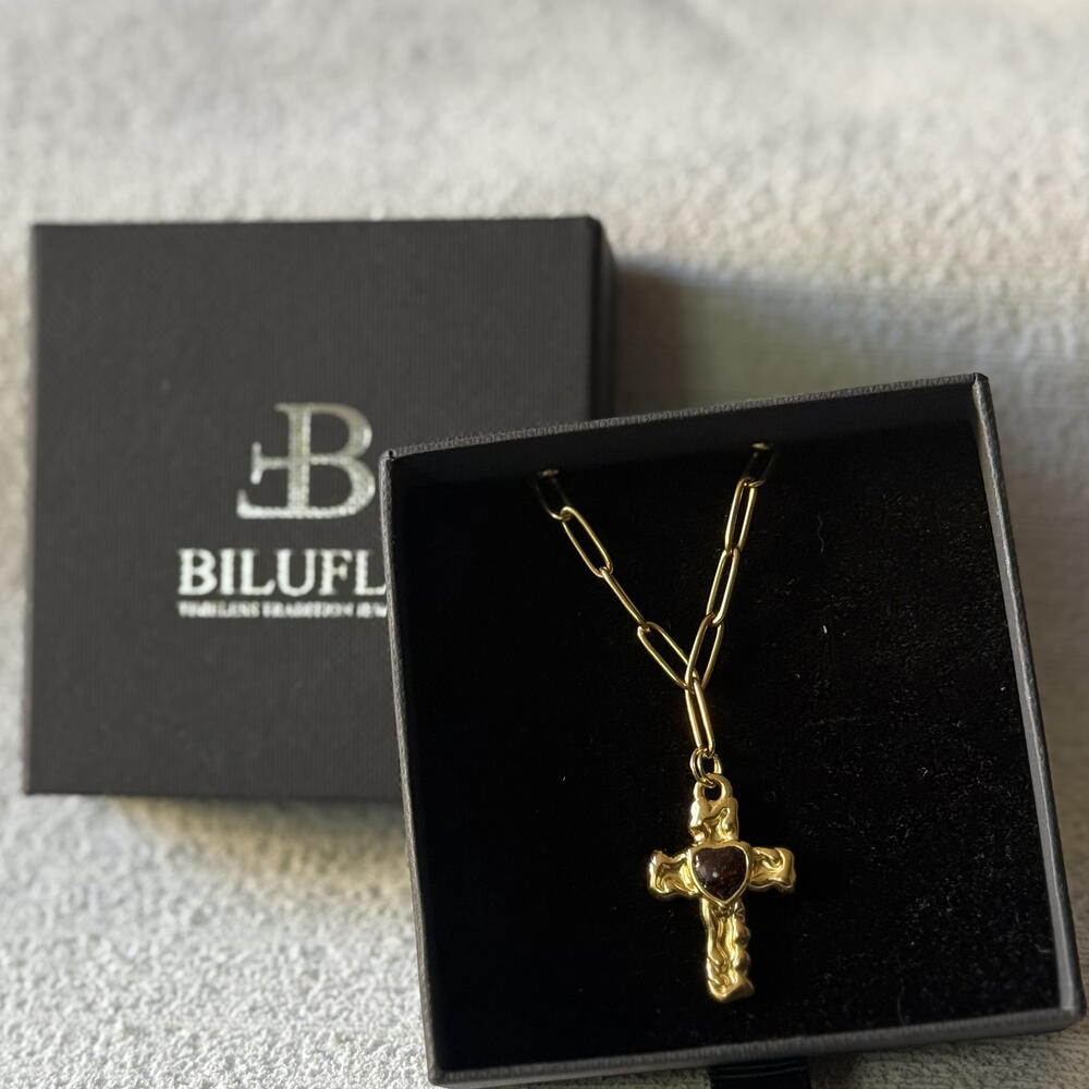 The Bilufla Cross Amulet Necklace is a piece that unites the ancestral symbol of the cross with the energy of natural elements. Handmade in stainless steel, you can choose its finish in gold or silver, according to the energy you wish to project. In the center, a small locket keeps what connects you with yourself: rose petals, black clay from Bisalhães, or a meaningful element you want to preserve as a personal amulet. Every detail adapts to you, making this jewel a unique and intimate piece, created to accompany you on your path. ✨ Details: - Materials: Gold or silver stainless steel + customizable filling (clay, petals, your own symbol) - Handmade in Portugal - Hypoallergenic and water-resistant - Customizable on request