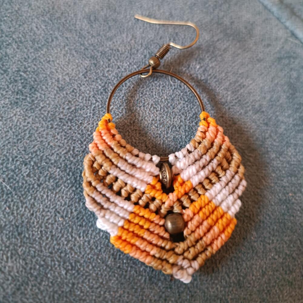 Handmade earrings woven using the knot-by-knot macramé technique with 1 mm waxed cord. Hypoallergenic. Weighing only 3 g each, they are very light and super comfortable, you won't notice you're wearing them. Available in several colors and can be personalized. Find the perfect combination of bohemian style and craftsmanship. Each pair is carefully handwoven with high-quality waxed cord, creating a unique and durable design. They are ideal for adding a touch of artisanal sophistication to your everyday look or for completing your outfit on special occasions. Available in a variety of colors and designs, they are an elegant and eco-friendly choice for your jewelry collection. By purchasing these handmade earrings, you are not only getting a unique piece but also supporting artisanal work. You contribute to fair trade and sustainability, promoting the preservation of traditional craft techniques. Handcrafted piece made by Artesaral in Spain.
