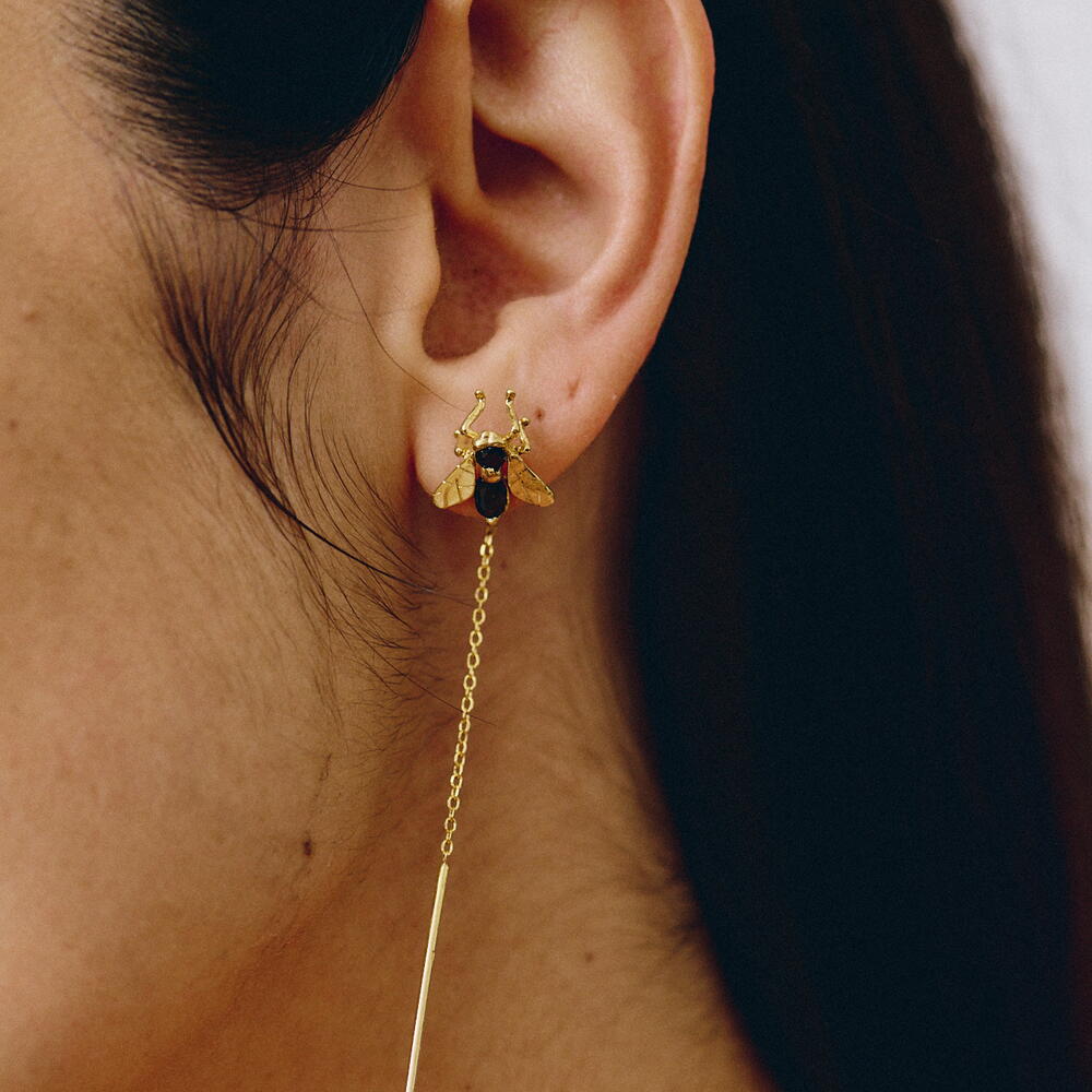 Each pair is designed and handcrafted in our workshop, combining sterling silver with an 18 kt gold plating and black cubic zirconia One of the earrings incorporates a chain system while the other maintains a simple design, giving prominence to the fly, creating a unique and contemporary visual play. 🪰 A jewel for those seeking different pieces, with personality and signature design. Estimated production time: 5–7 days 🎁 They are sent carefully presented, ready to gift.