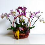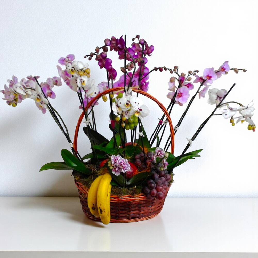 The Orchid and Fruit Basket combines the exotic elegance of Phalaenopsis orchids with the freshness of natural fruit, creating a unique arrangement that symbolizes life, energy, and beauty. Perfect as an exclusive gift or as a centerpiece for events, receptions, or sophisticated spaces. The harmony between the vibrant color of the fruit and the delicacy of the flowers provides a natural balance that captivates at first glance.