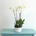 Orchid centerpiece mounted in a wicker basket and decorated with salix