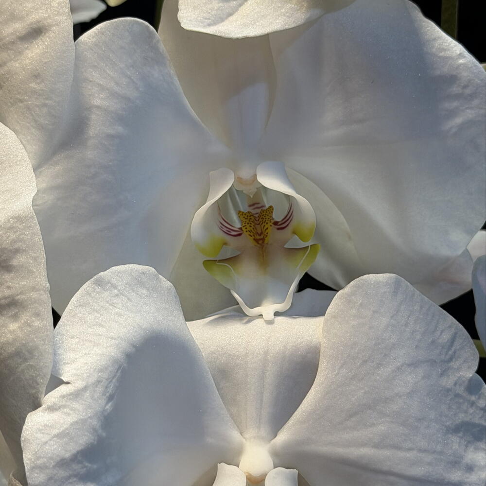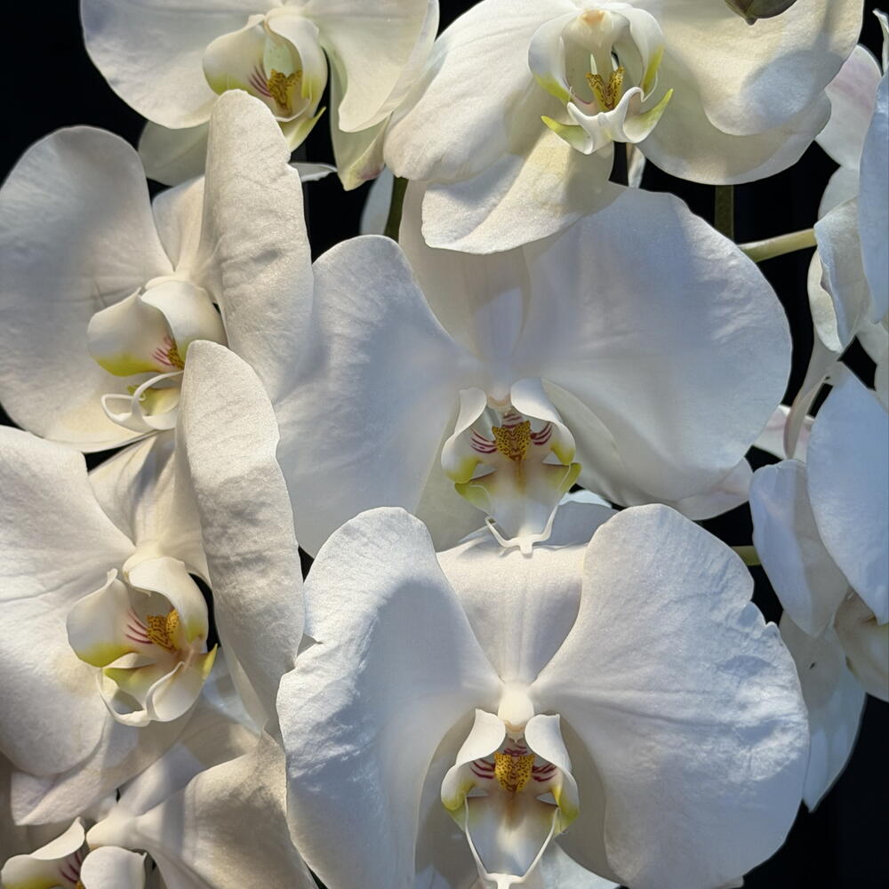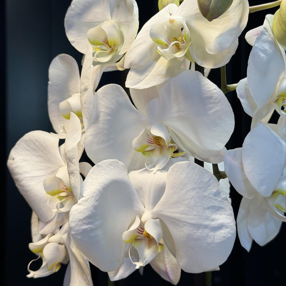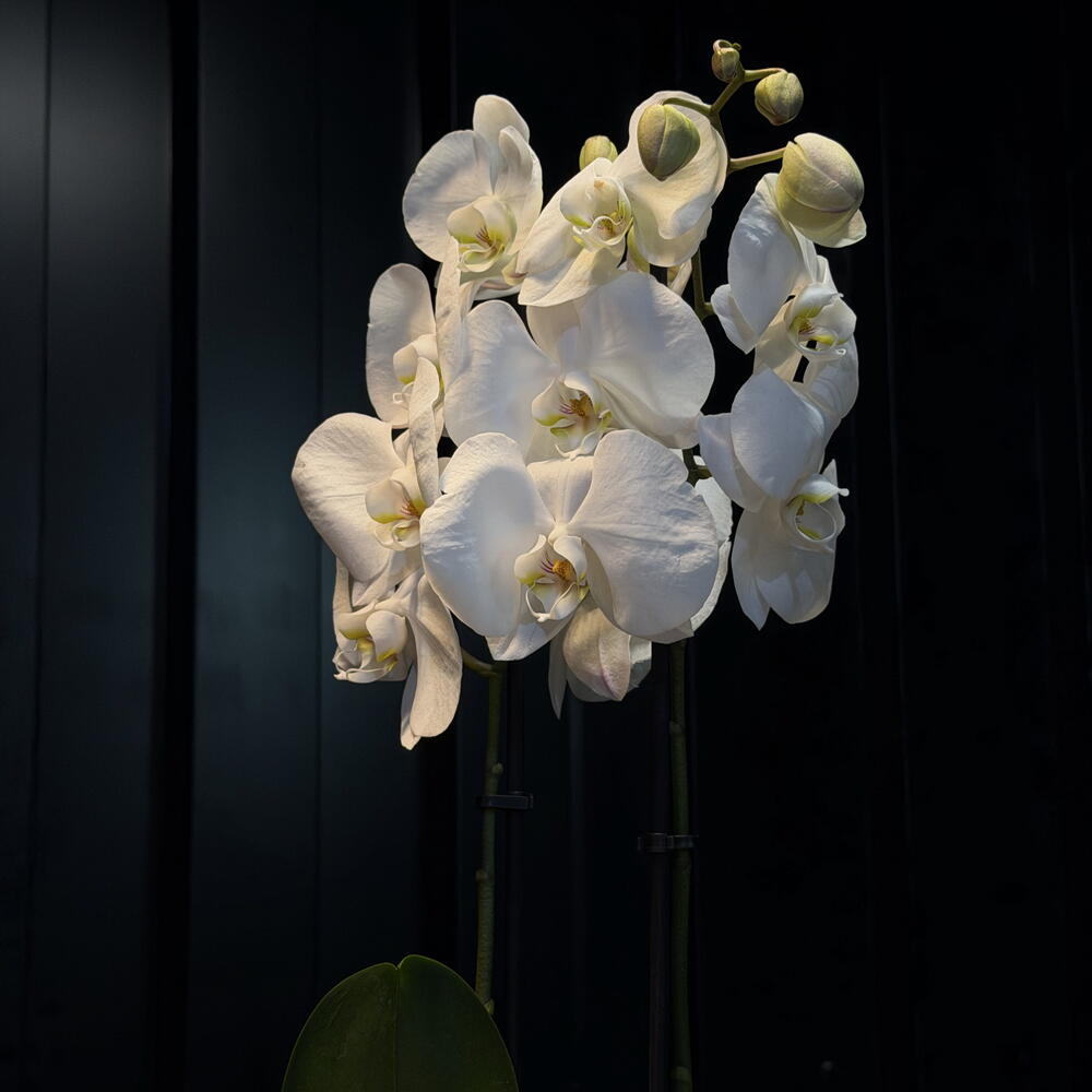 This orchid looks like a white constellation suspended in the shade: flowers soft as clouds, green buds ready to awaken, and an elegant bearing that illuminates even the darkness. A beauty that makes no noise, yet dominates the scene.