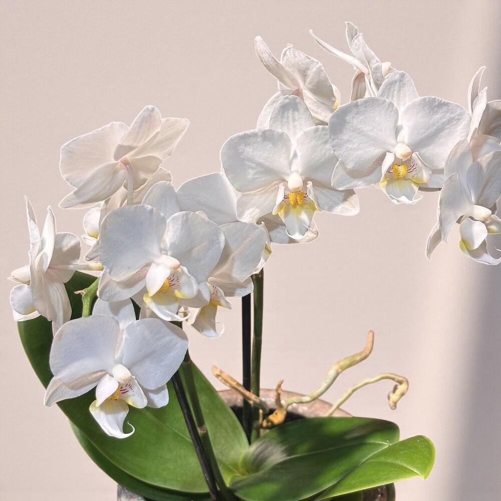Pure elegance in every petal: this white Phalaenopsis orchid is a natural gem that brightens any space with its simplicity and sophistication. Its impeccably white flowers symbolize peace and harmony, creating a serene atmosphere in the home or office. Perfect for gifting or for adding a minimalist, modern touch to the decor. *Pot included